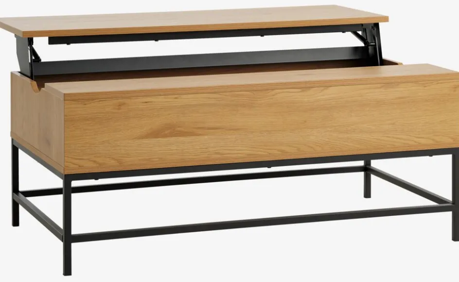 En MDF mélaminé, acier, plastique ABS. Avec plateau relevable et espace de rangement. l60 x L110 x H45/57 cm