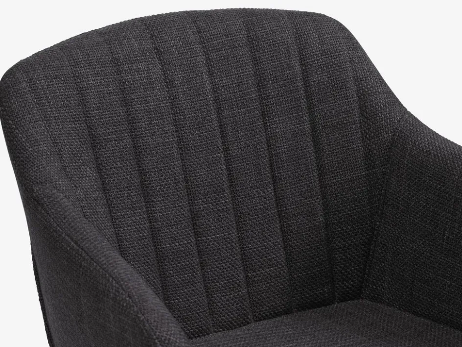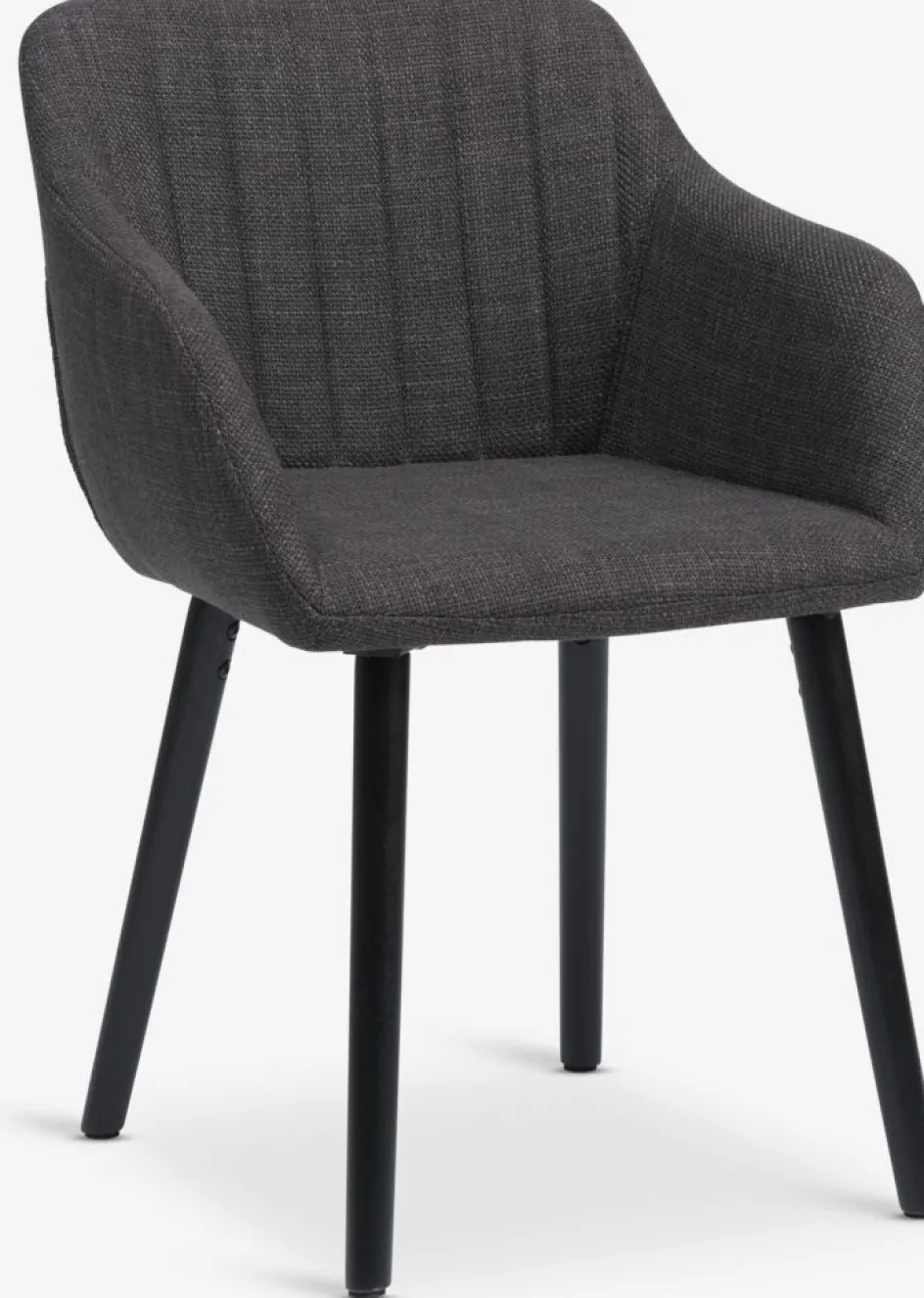Chaise de salle à manger avec accoudoirs offrant un soutien et un confort supplémentaires. La chaise possède une assise rembourrée et un dossier en tissu gris anthracite. Pieds en bois massif.