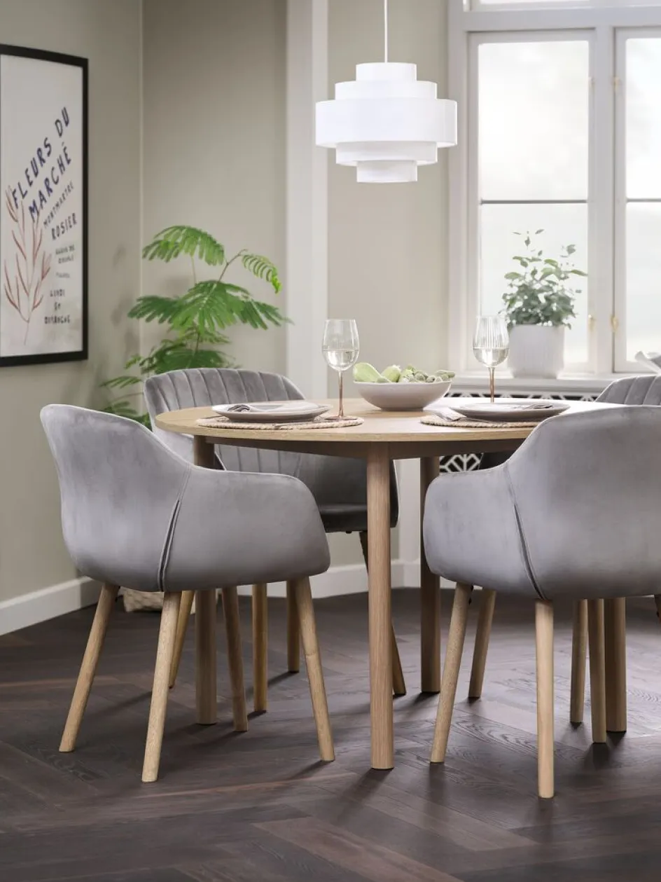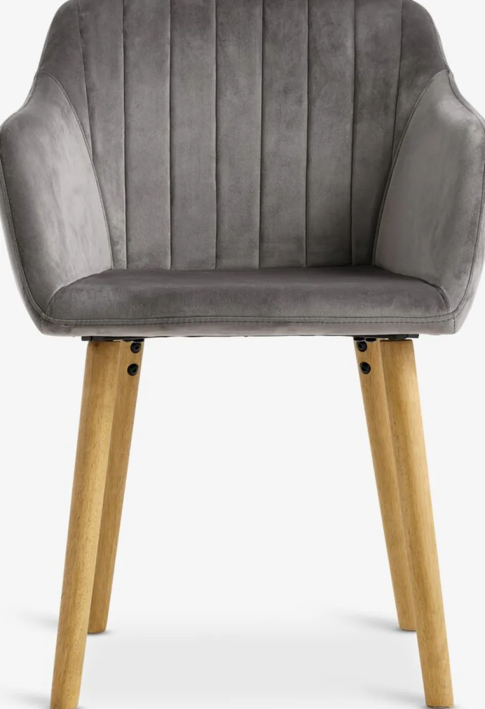 Chaise de salle à manger avec accoudoirs offrant un soutien et un confort supplémentaires. Assise rembourrée et dossier en tissu velours gris. Pieds en bois massif. l59 x H82 x P59 cm