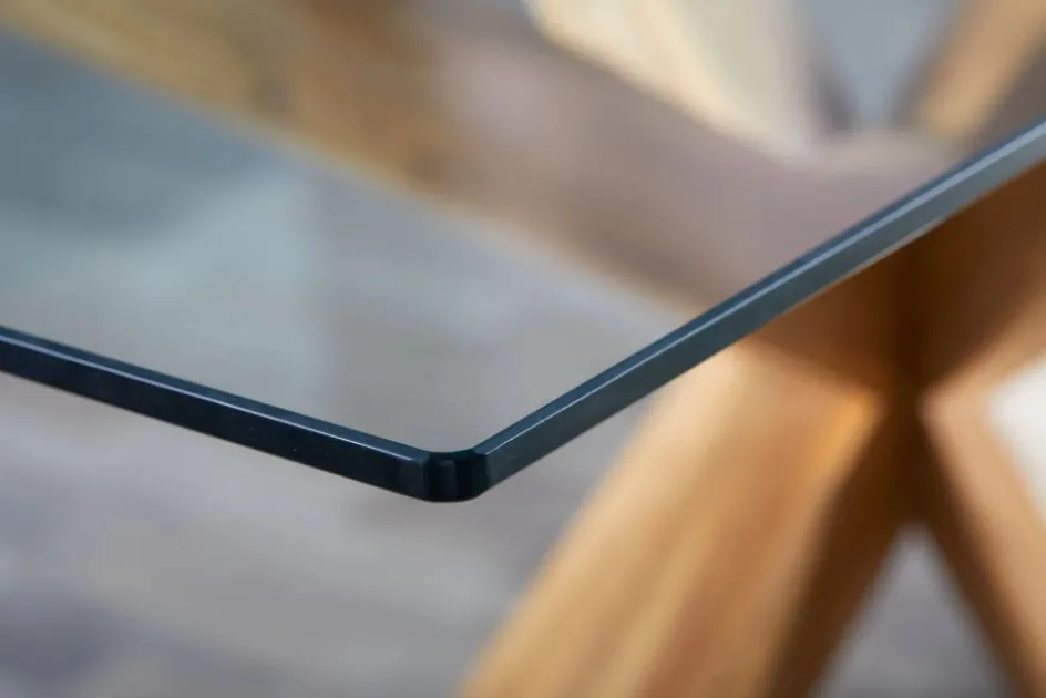 Table de salle à manger avec plateau de table en verre trempé et pieds en chêne massif. Le bois est traité à l’huile pour le protéger et mettre en valeur sa couleur naturelle. l90 x L160 x H75 cm