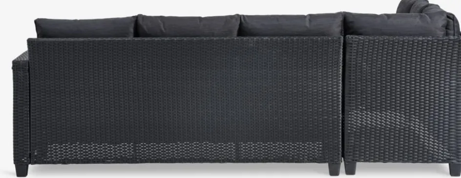 Détendez-vous dans votre espace extérieur avec l’ensemble lounge AGERMOSE. Cet ensemble lounge 6 places noir comprend un canapé d’angle avec des coussins confortables et d’une table basse assortie avec un plateau en imitation bois.