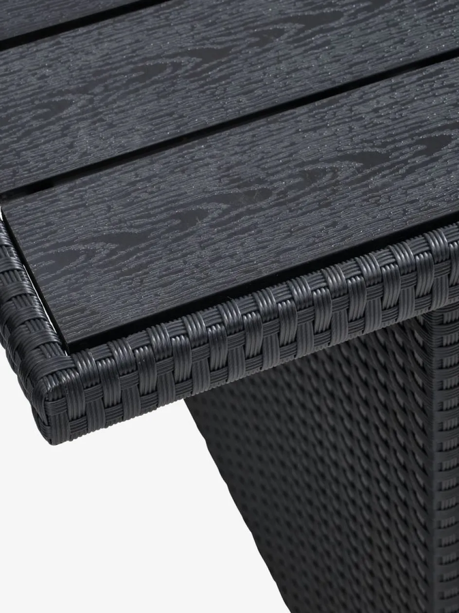La table basse est dotée d’un plateau en imitation bois. Elle présente l’aspect et la texture du bois naturel sans nécessiter d’entretien. Elle est fabriquée à partir de plastique, tel que le polystyrène, qui constitue un matériau durable. L’imitation bois résiste aux intempéries, ce qui signifie qu’il peut supporter l’exposition au soleil, à l’humidité et aux changements de température. Évitez de placer des objets en verre exposés directement au soleil sur l’imitation bois, car cela pourrait causer des traces de brûlure et une décoloration.