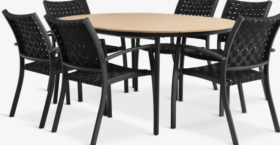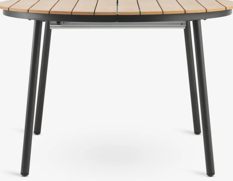 Ensemble meubles de jardin 4 places. Table: Aluminium, acier et imitation bois. Ø118 x H75 cm. Incl. 1 rallonge pouvant être rangée sous le plateau. Dimensions avec rallonge: l118 x L168 x H75 cm. Chaise: Aluminium et polypropylène. Empilable.