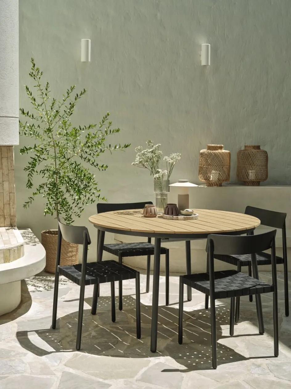 Ensemble meubles de jardin 4 places. Table: Aluminium, acier et imitation bois. Ø118 x H75 cm. Incl. 1 rallonge pouvant être rangée sous le plateau. Dimensions avec rallonge: l118 x L168 x H75 cm. Chaise: Aluminium et polyester. Empilable.