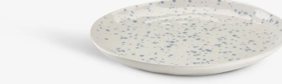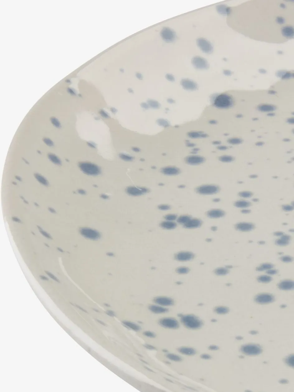 Assiette en grès avec un design moucheté bleu et blanc qui se marie parfaitement avec la décoration de table modernes. Idéale comme assiette pour le déjeuner ou le petit-déjeuner. Ø21 cm