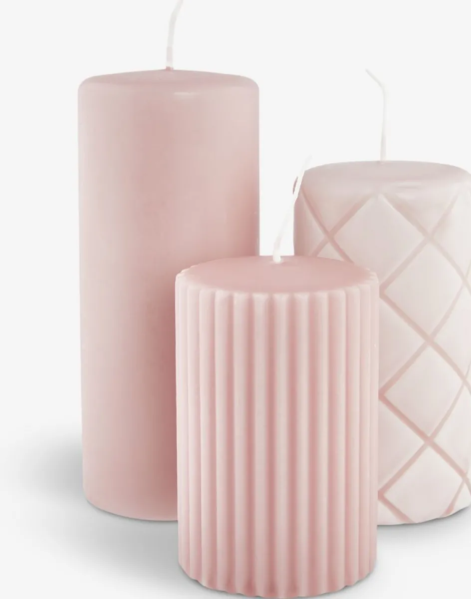 Lot de bougies pilier dans des nuances de couleur rose, avec trois finitions texturées différentes et trois hauteurs différentes. Elles offrent une durée d’éclairage allant de 25 à 42 heures. Lot de 3. Ø6 x H9/11/14 cm