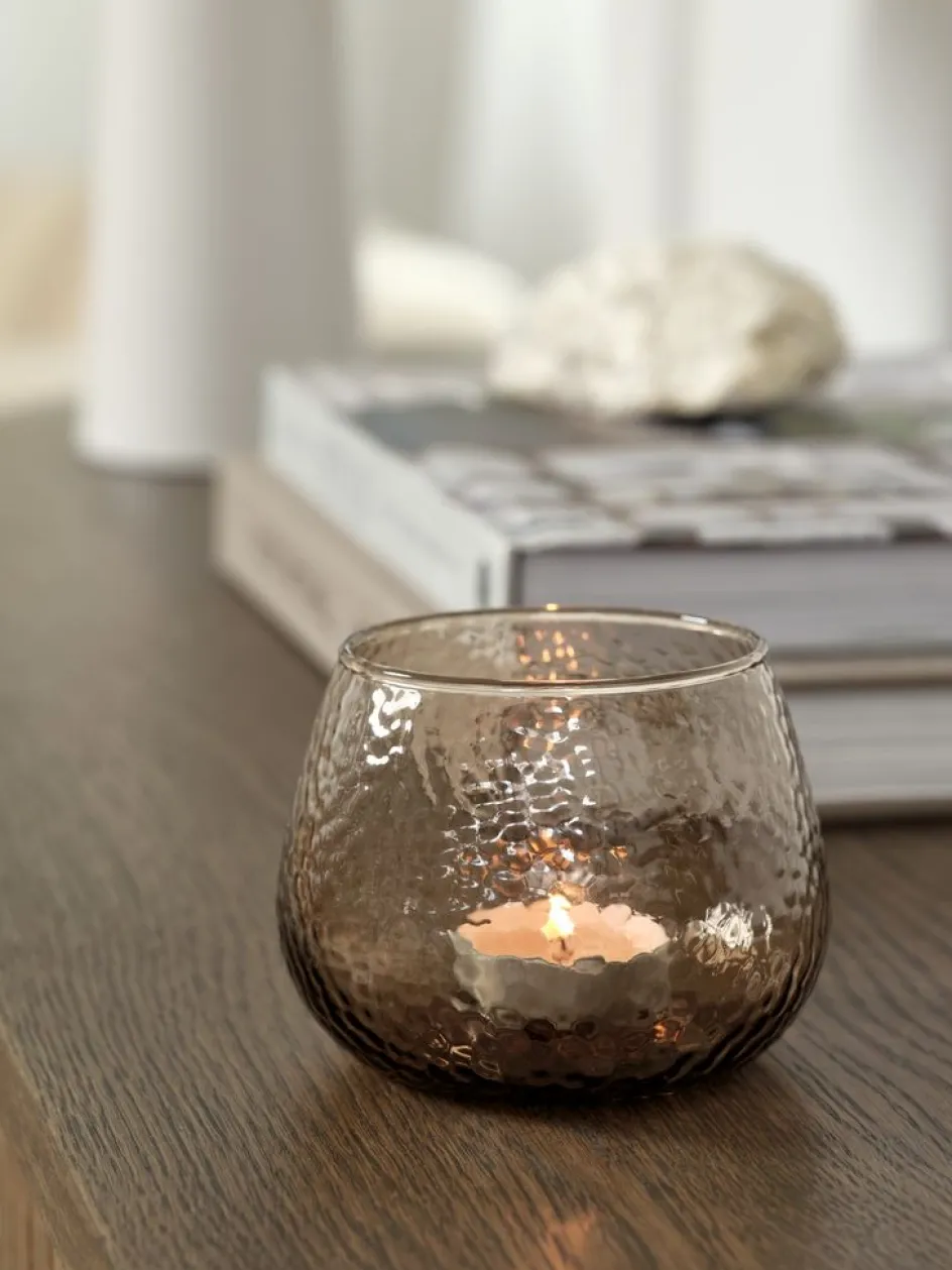 Photophore en verre brun avec une surface texturée originale qui diffuse la lumière pour créer une lueur chaude et douce. Ø10 x H8 cm