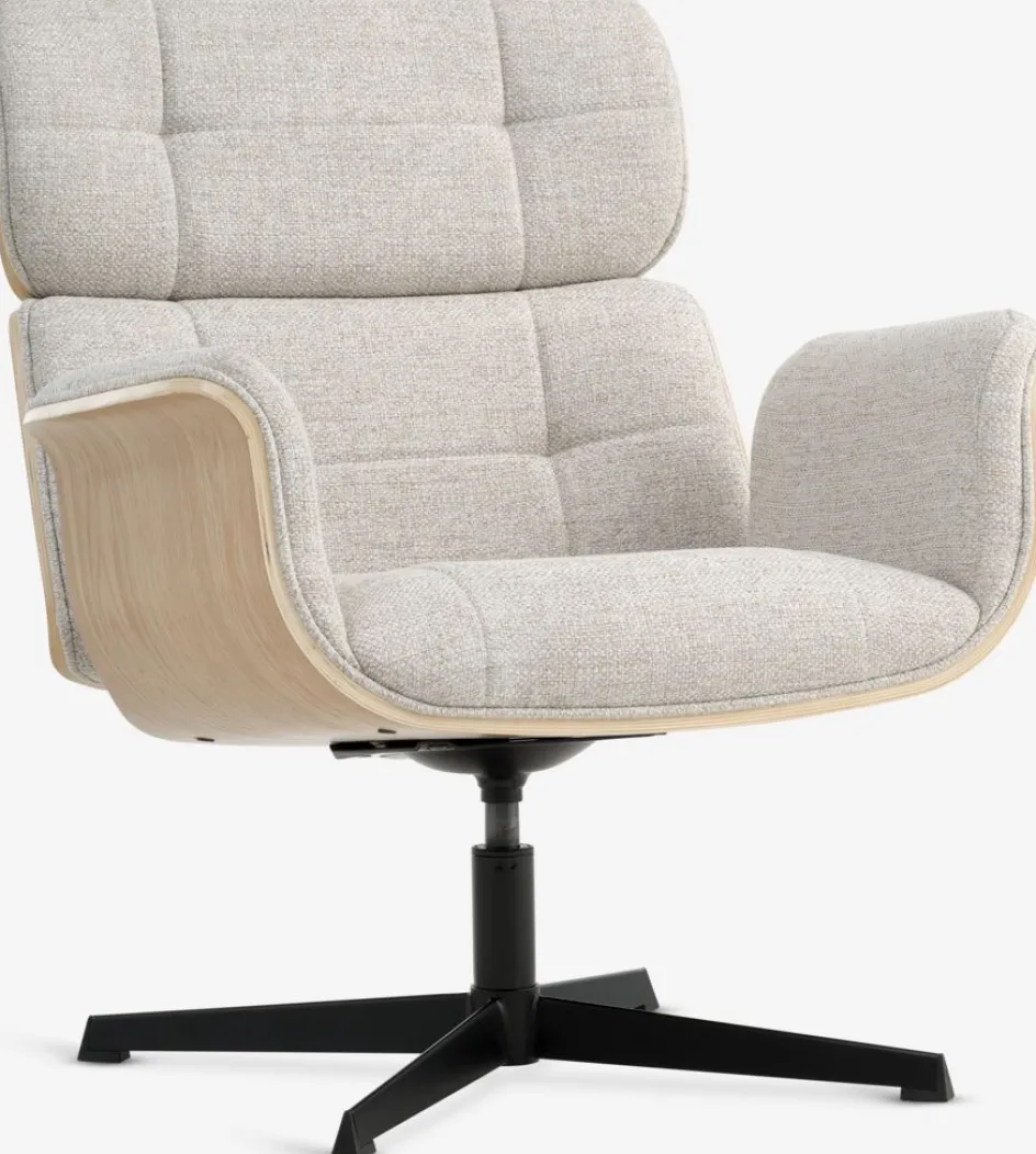 Tissu et placage chêne. Coussins d’assise et de dossier en mousse. Avec base pivotante et mécanisme de fermeture. l74 x H89 x P79 cm