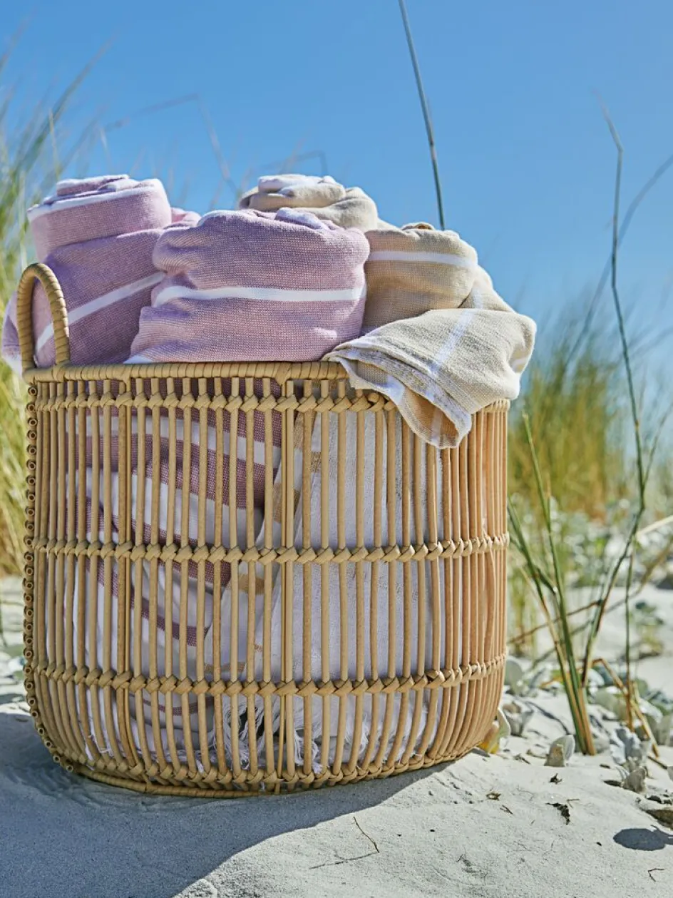 Panier en motif tissé naturel pour un rangement polyvalent. Idéal pour organiser des objets tels que des jouets ou des couvertures. Les poignées pratiques facilitent le transport. Ø35 x H35 cm
