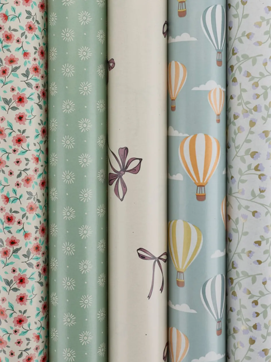 Papier cadeau aux motifs variés, principalement dans les tons bleus et blancs. Fabriqué à partir de papier recyclé FSC®. l70 x L600 cm