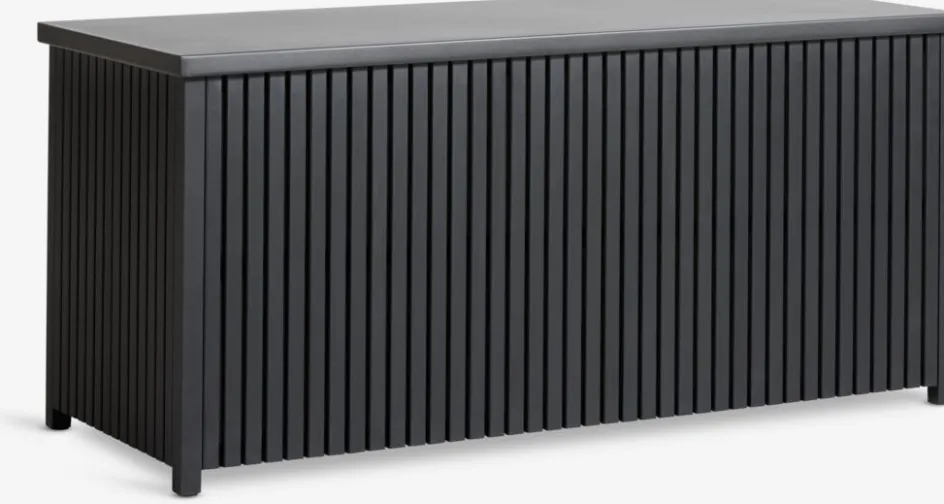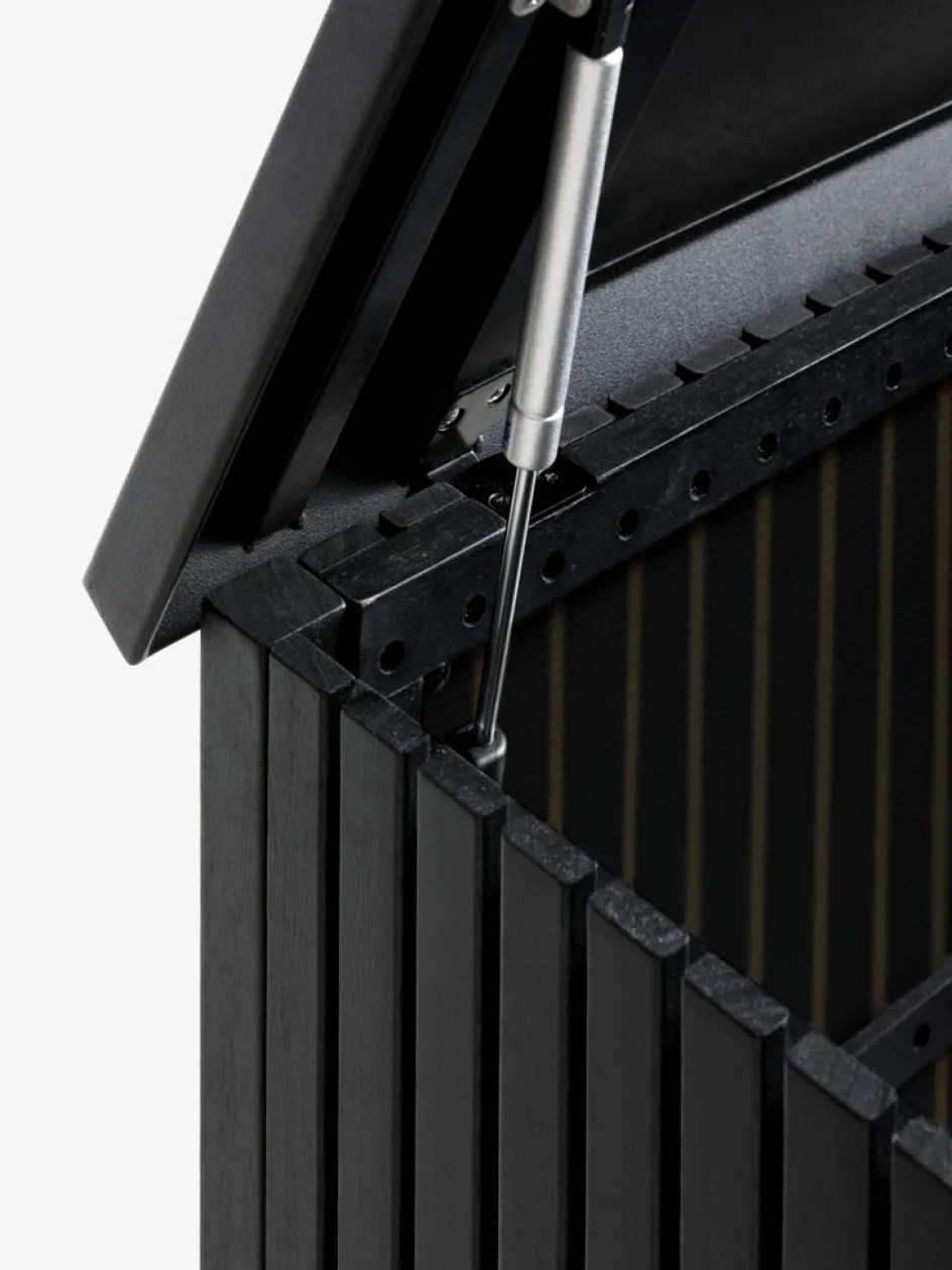 Coffre à coussins en bois FSC® vernis et acier galvanisé. Avec couvercle hydraulique facile à utiliser. l133 x H61 x P54 cm