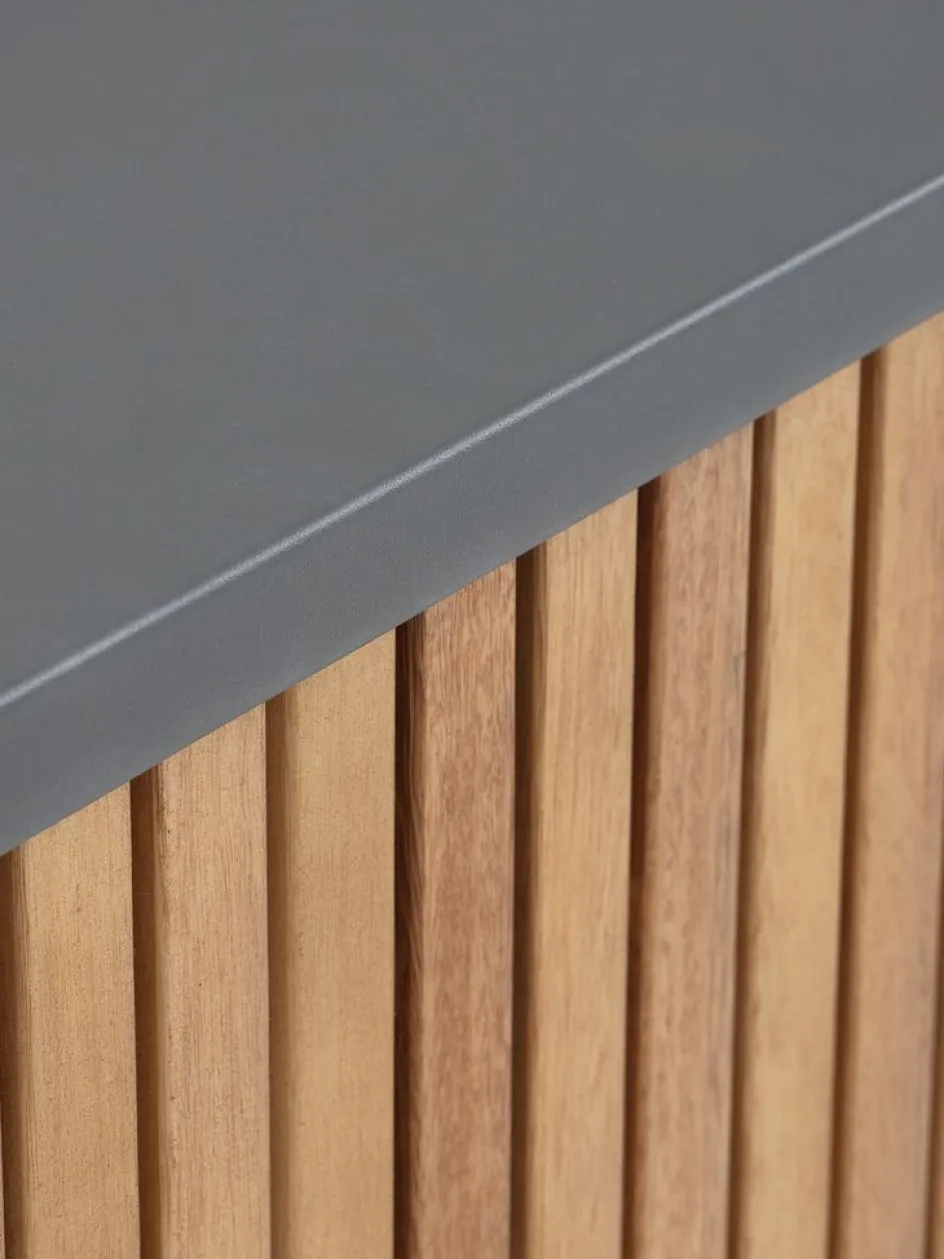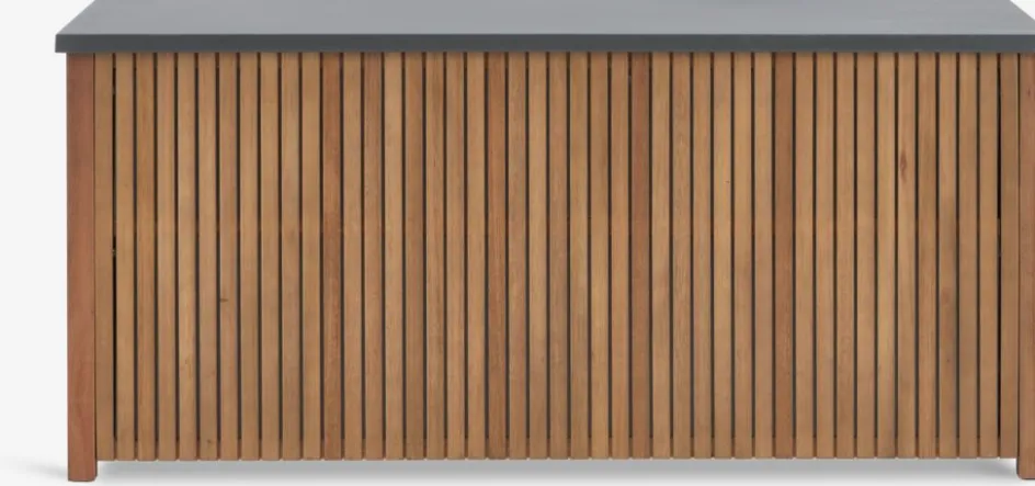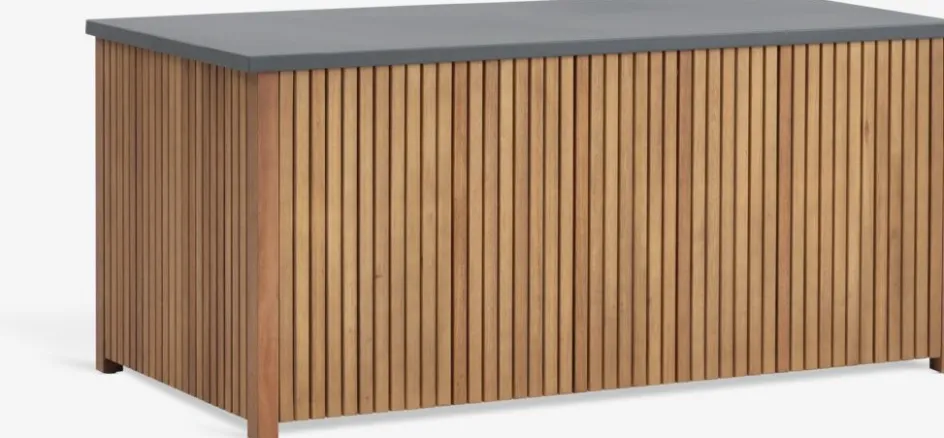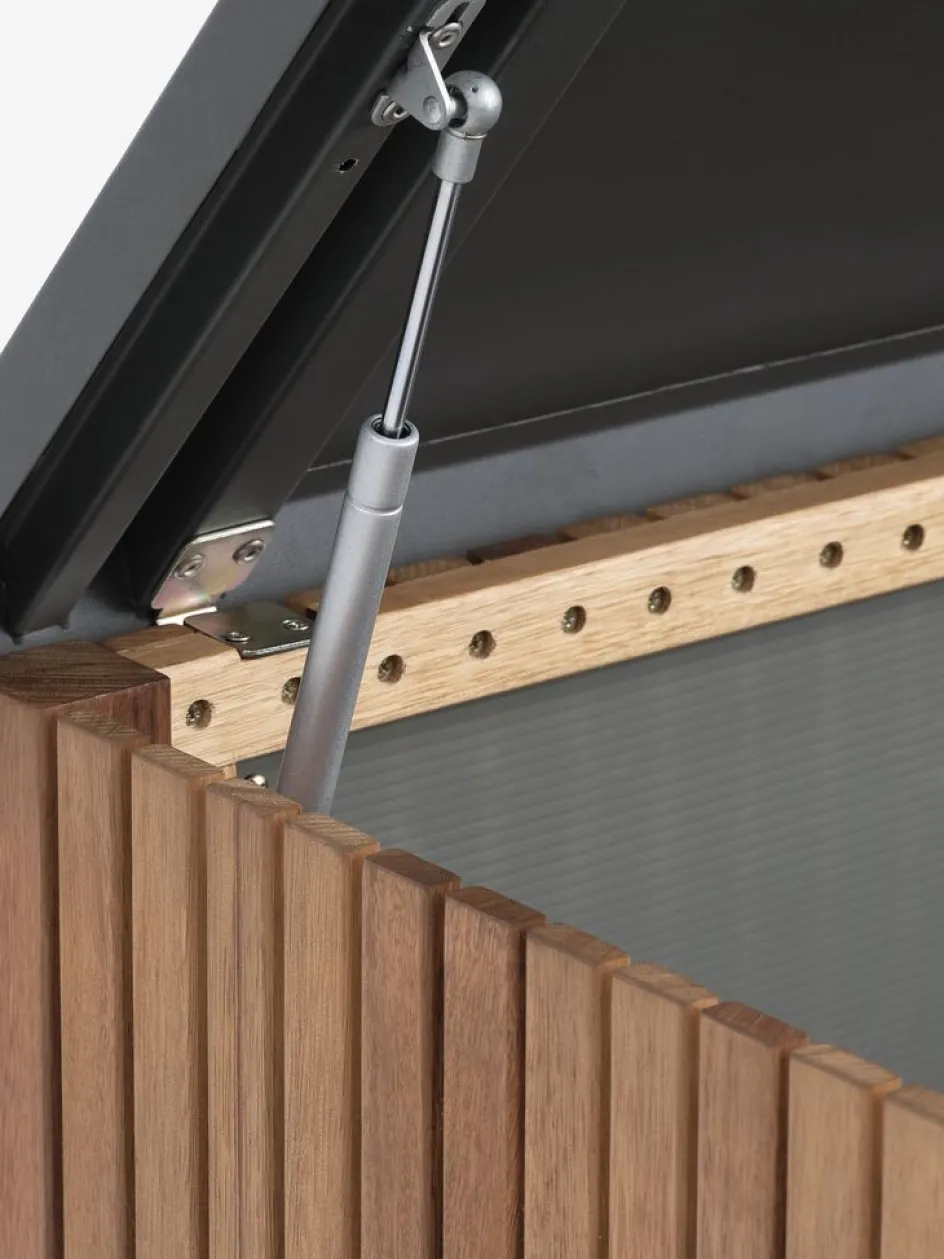 Coffre à coussins en bois FSC® huilé et acier galvanisé. Avec couvercle hydraulique facile à utiliser. l155 x H71 x P78 cm
