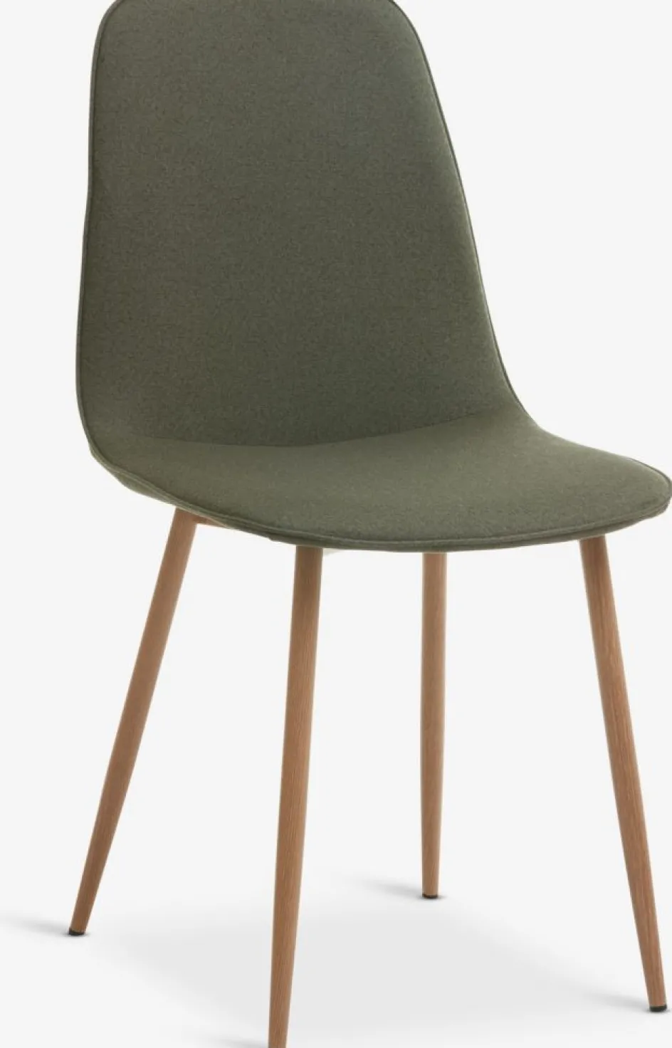 Chaise de salle à manger avec assise rembourrée et dossier en tissu vert olive. Pieds en acier aspect chêne.