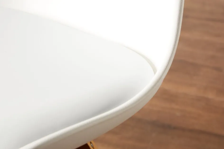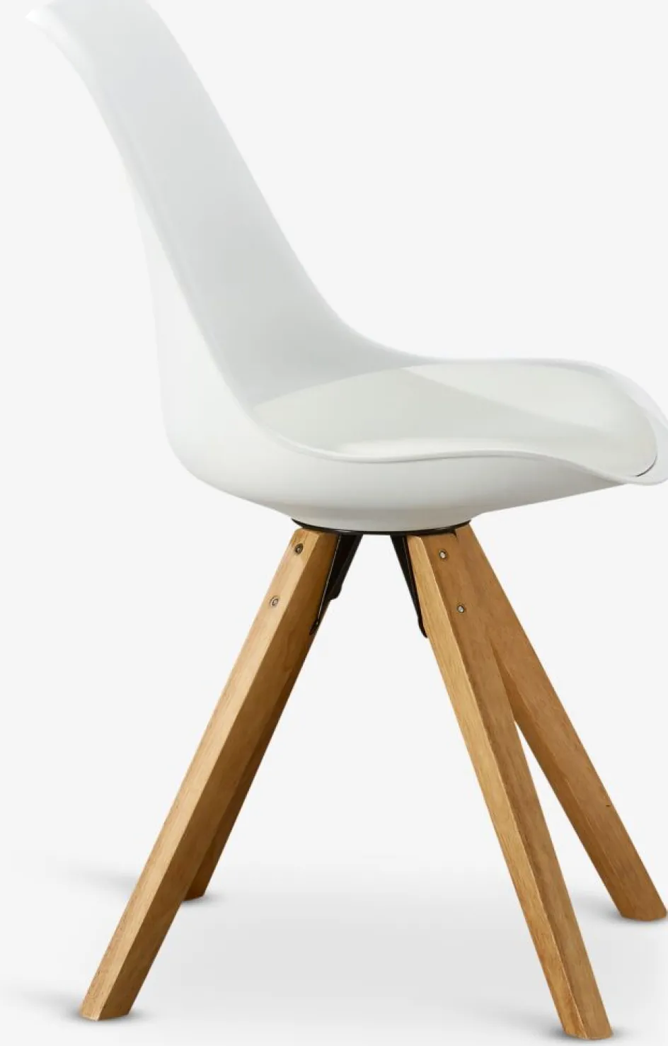 Chaise de salle à manger avec assise moulée blanche et coussin non amovible assorti. Pieds en bois massif.