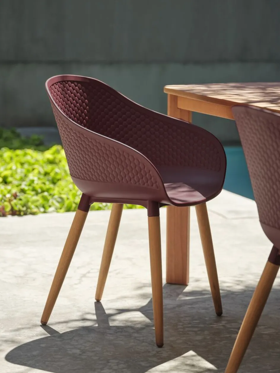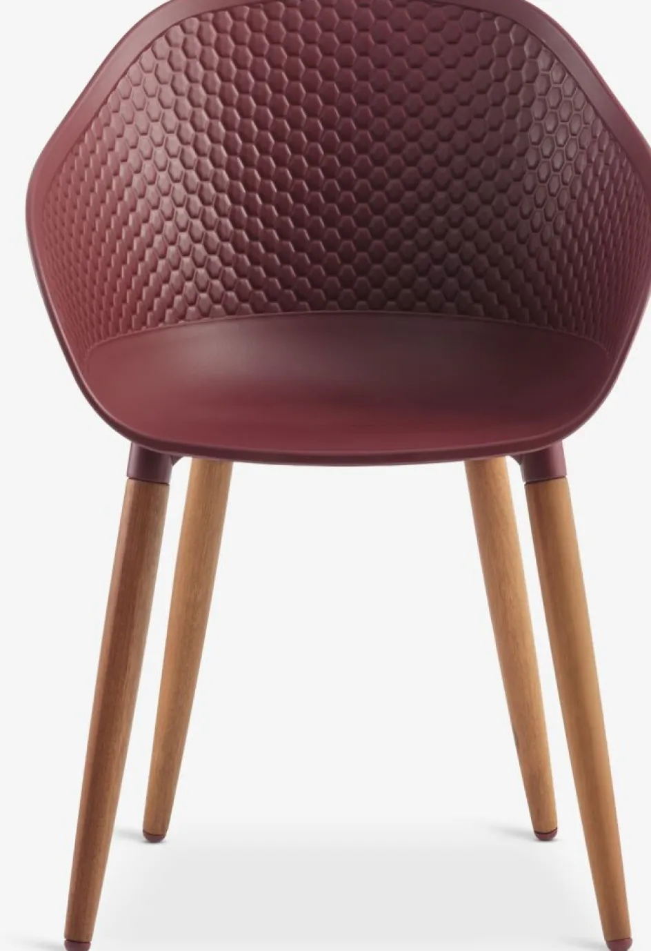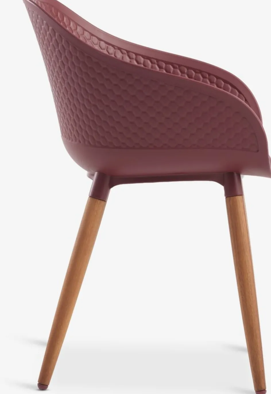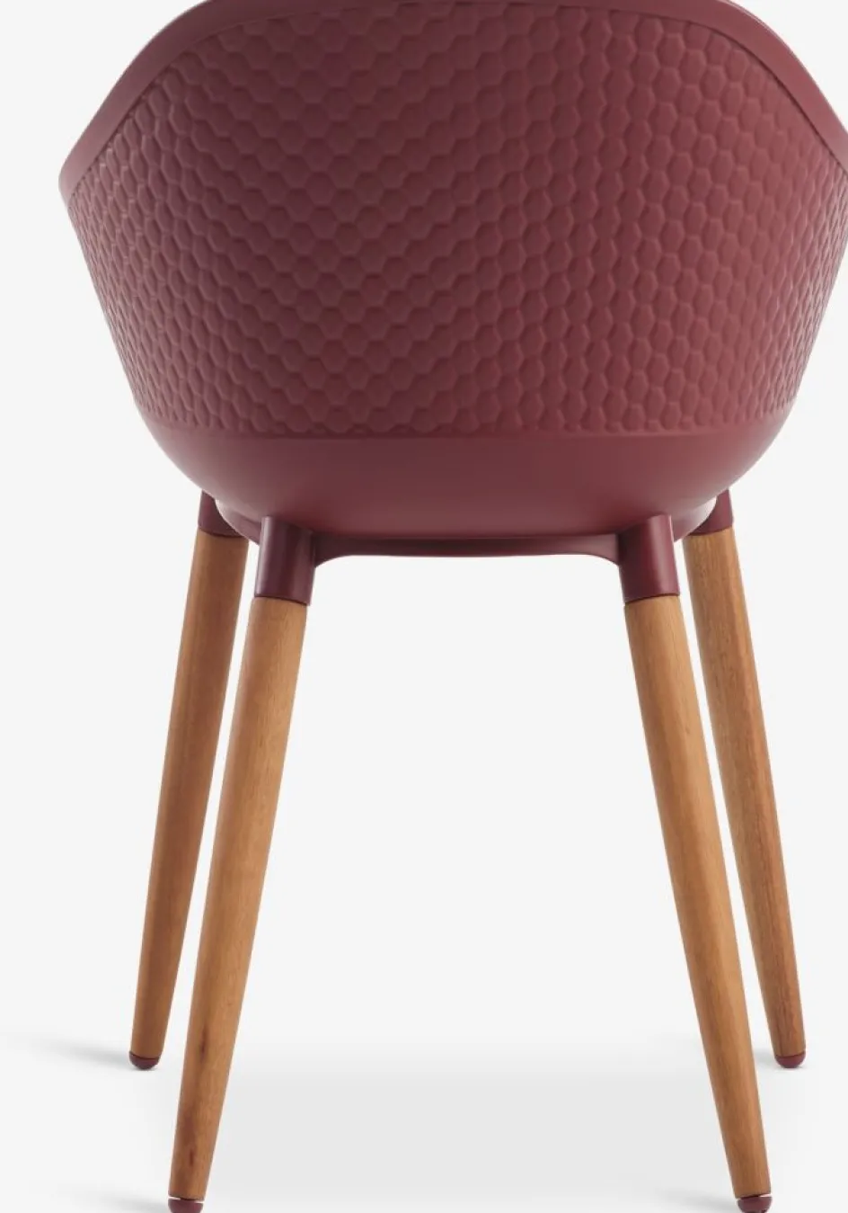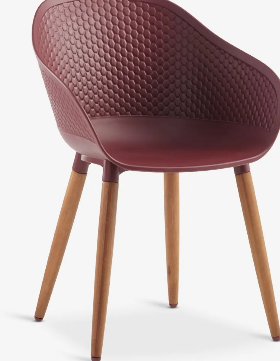 Chaise de jardin couleur châtaigne avec assise moulée en plastique (90% recyclé), qui est résistant aux UV pour empêcher que sa couleur ne s’estompe. Les pieds sont en bois dur FSC® huilé. Le bois durable est traité avec de l’huile pour le protéfer et rehausser sa couleur naturelle. L’huilage régulier du bois est recommandé pour préserver sa couleur et le protéger de l’humidité.