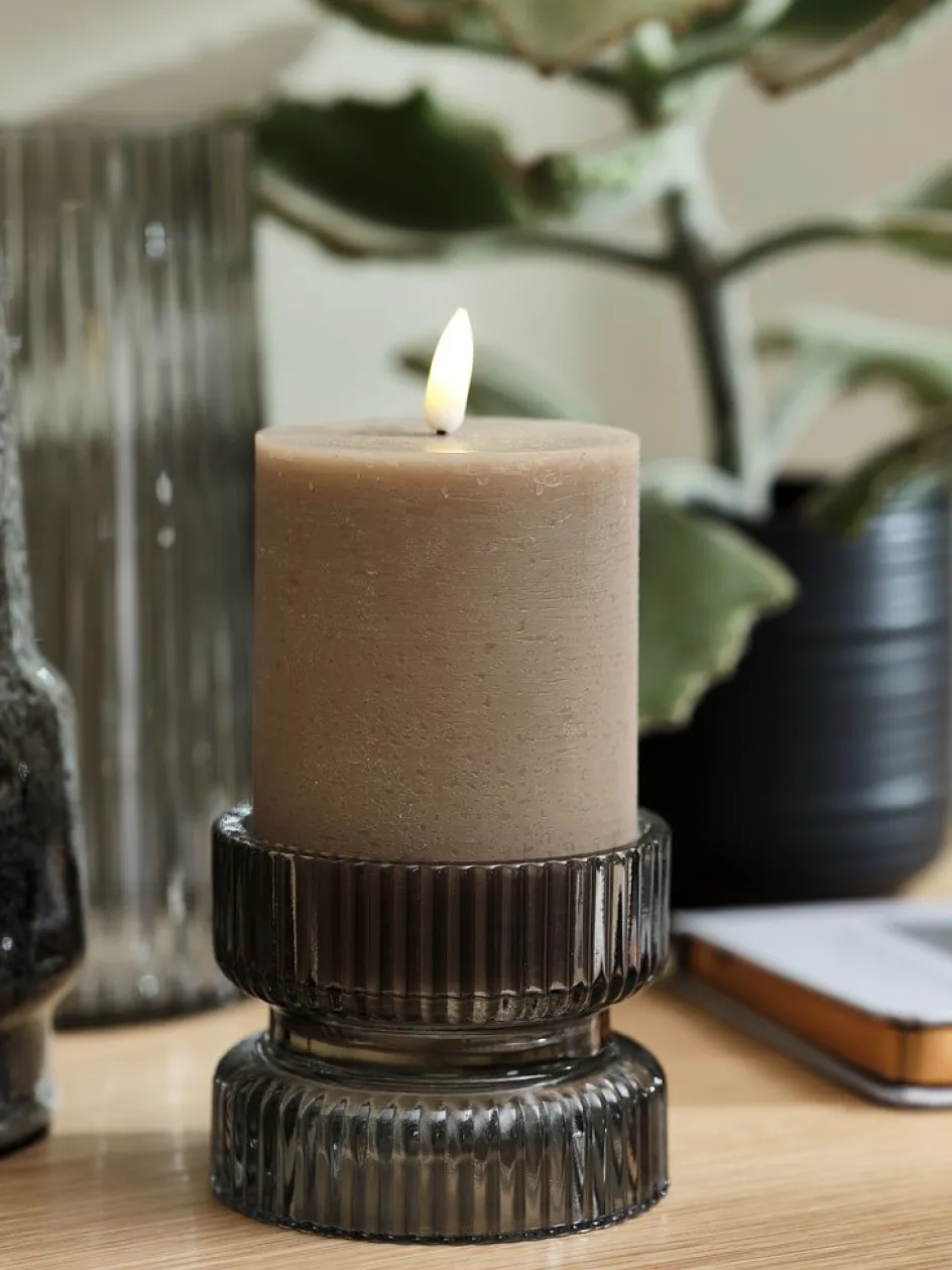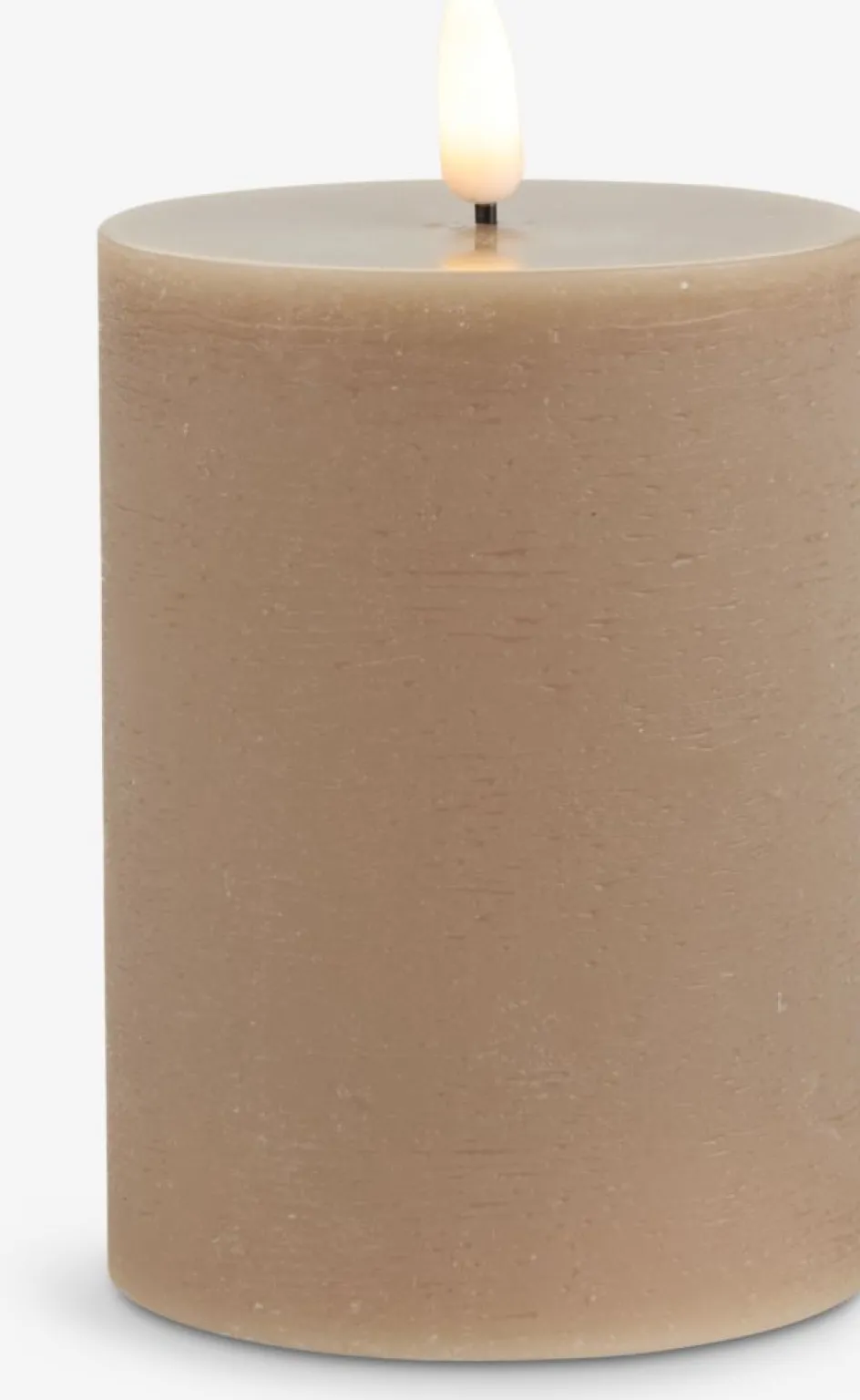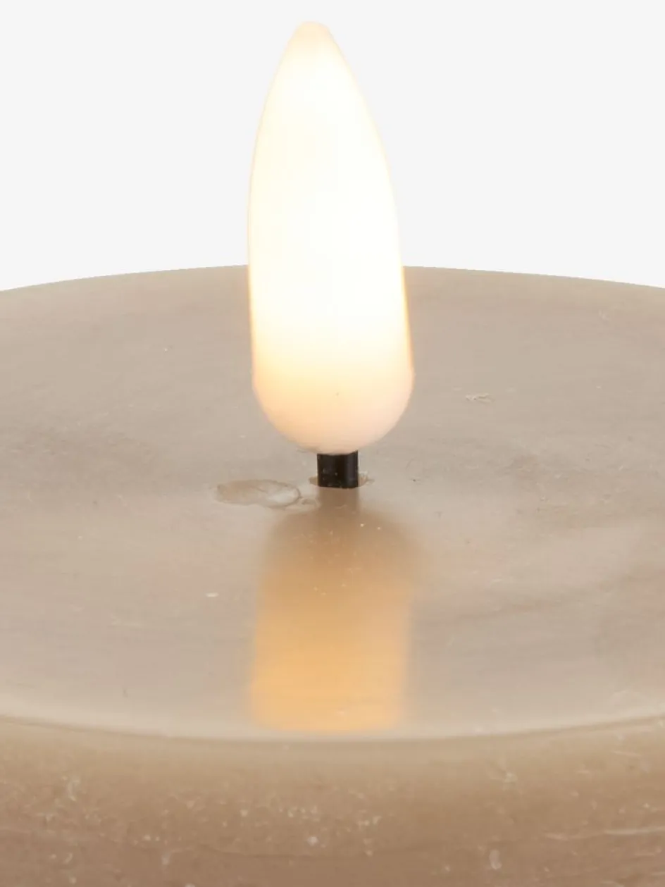 Bougie pilier LED sable avec fonction minuterie, permettant 6 heures allumées et 18 heures éteintes. Parfaite pour créer une lueur chaleureuse et une ambiance cosy dans n’importe quelle pièce. Nécessite 2 piles AA (non incluses). Ø8 x H10 cm