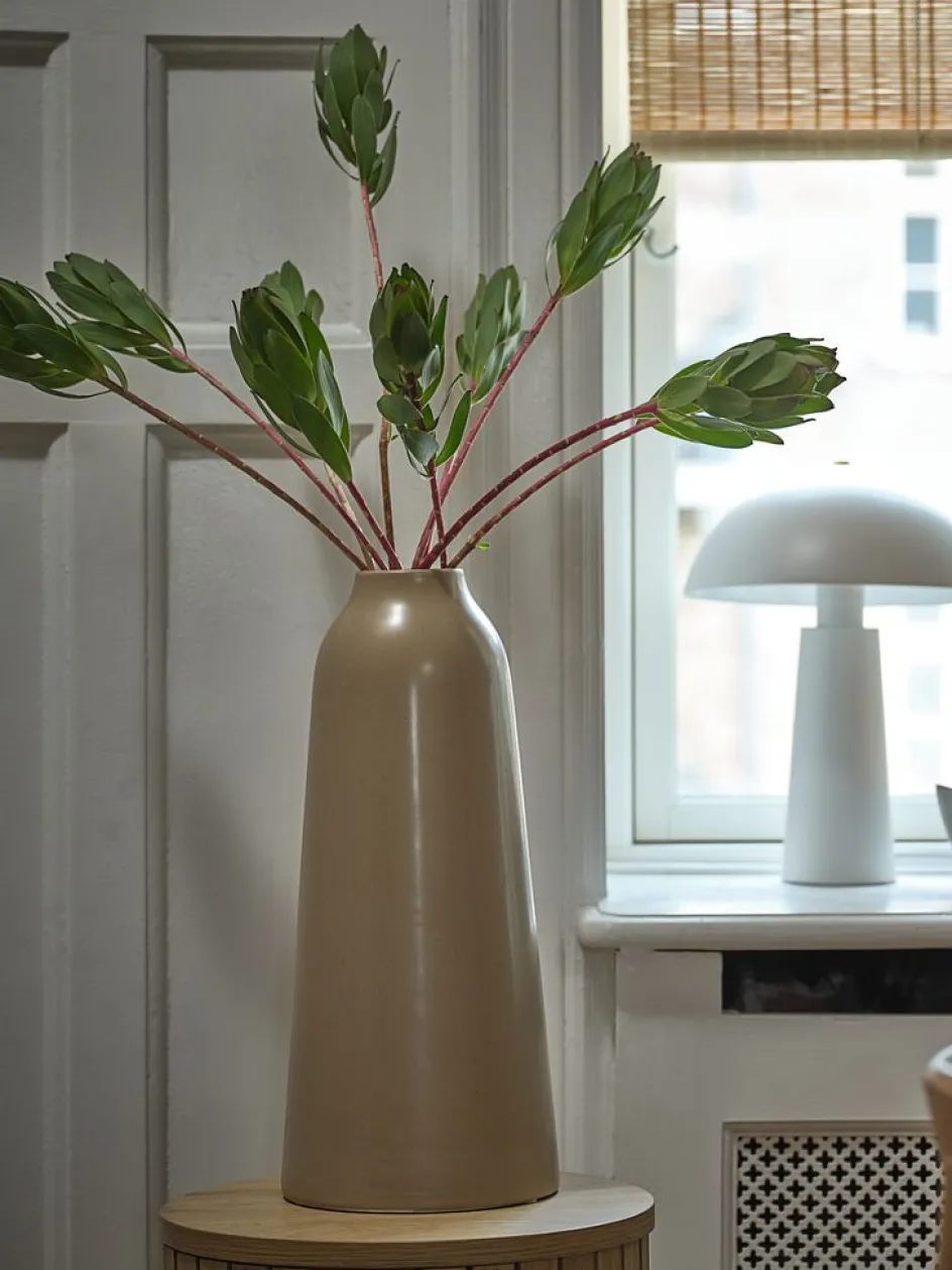 Vase beige en grès. Ce vase haut se distingue par sa forme raffinée et sa finition lisse. Il a une ouverture étroite, parfait pour y mettre des tiges ou simplement en tant qu’objet décoratif. Ø20 x H45 cm