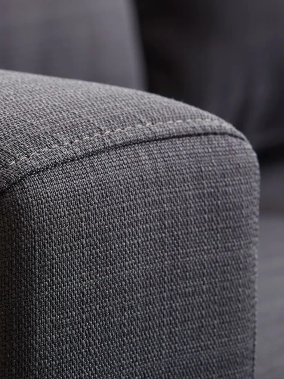 En panneau de particules, contreplaqué. Garnissage : mousse polyuréthane (24/50-55 kg/m³). Revêtement : polyester. Pieds : bois de caoutchouc massif. 3 places. Non réversible. l228 x H80 x P80/154 cm