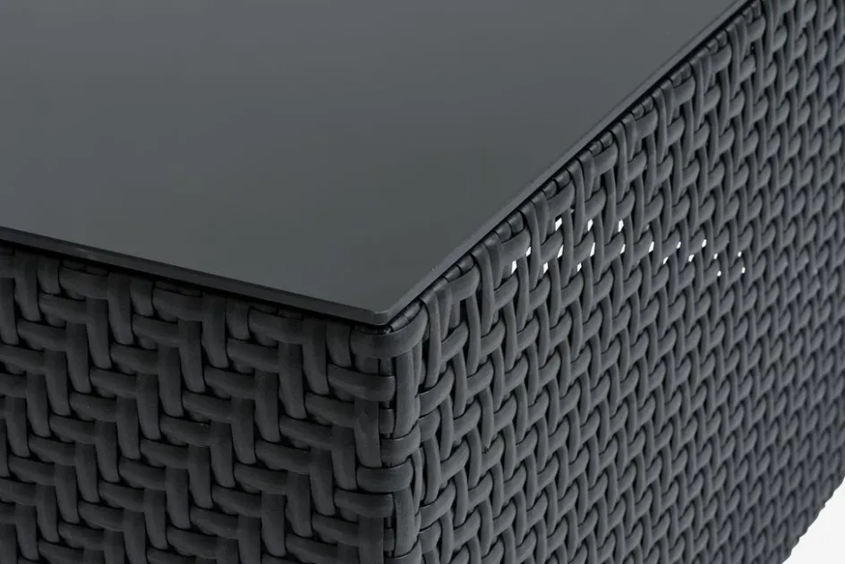 La table lounge a un plateau fabriqué en verre trempé. Ce type de verre a été traité thermiquement afin d’obtenir une surface robuste et durable, résistante à l’usure quotidienne et difficile à briser. Le verre trempé résiste aux intempéries, ce qui signifie qu’il peut supporter l’exposition au soleil, à l’humidité et aux changements de température.