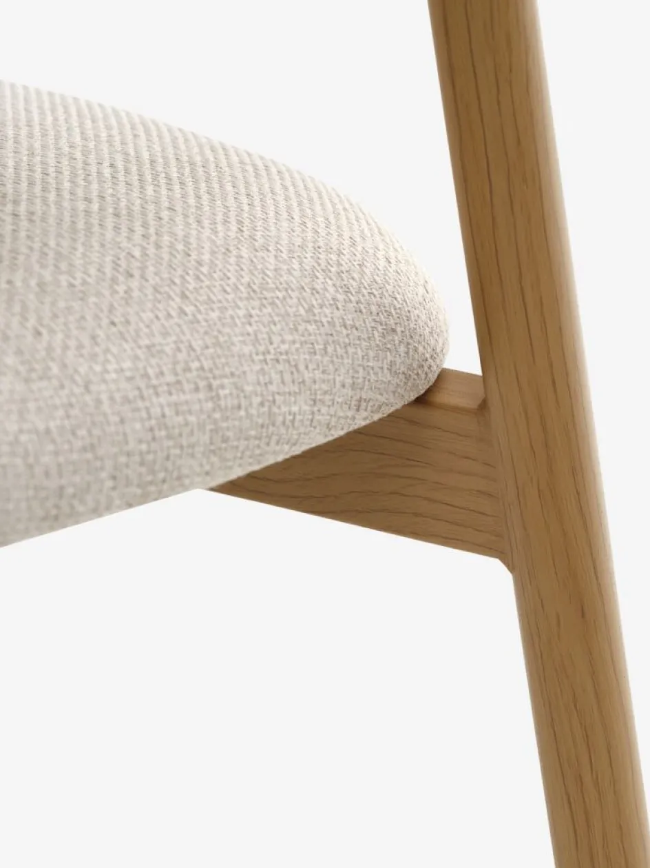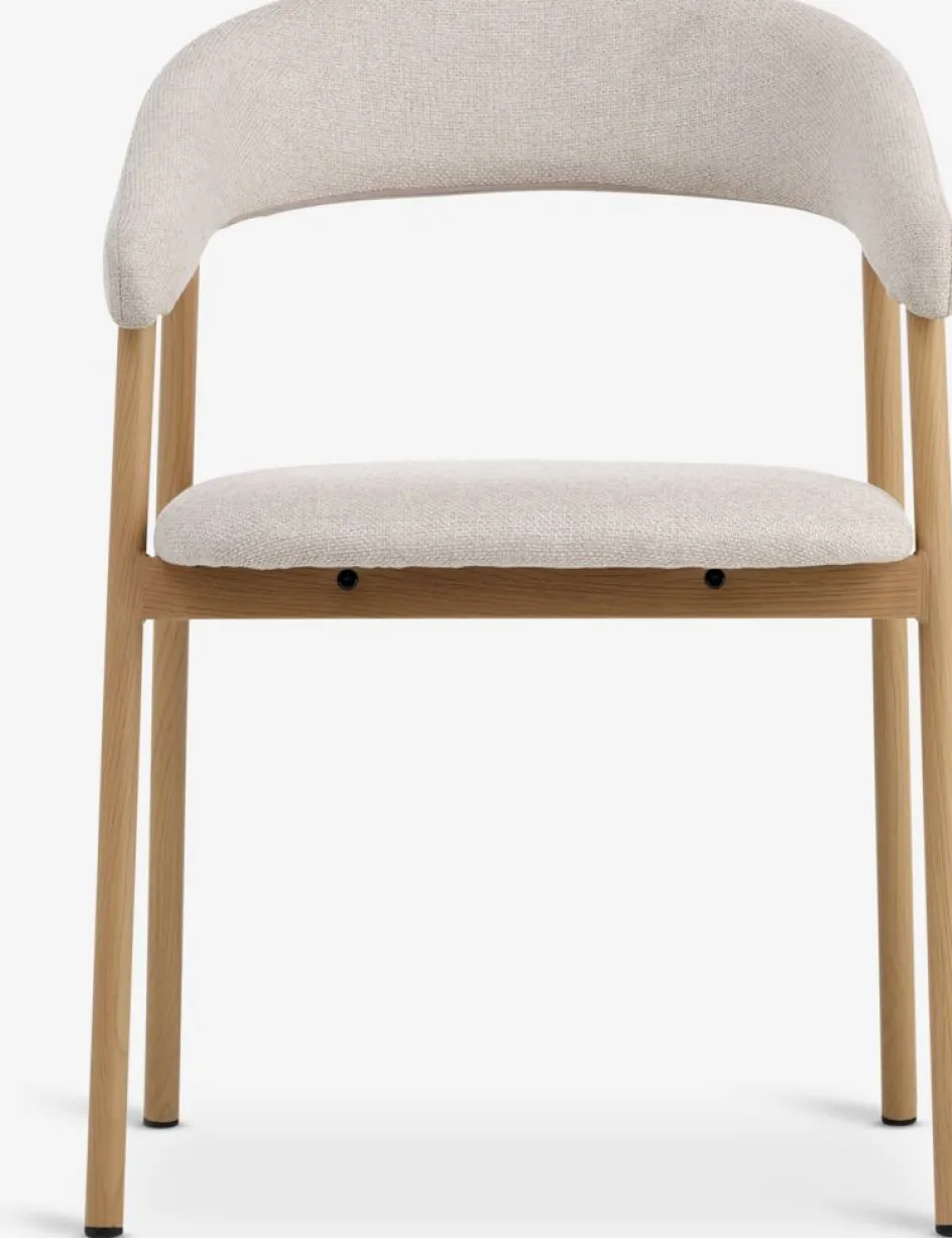 Chaise de salle à manger avec des accoudoirs qui offrent un soutien et un confort supplémentaires. Assise rembourrée et dossier incurvé en tissu beige. Pieds en acier aspect chêne.