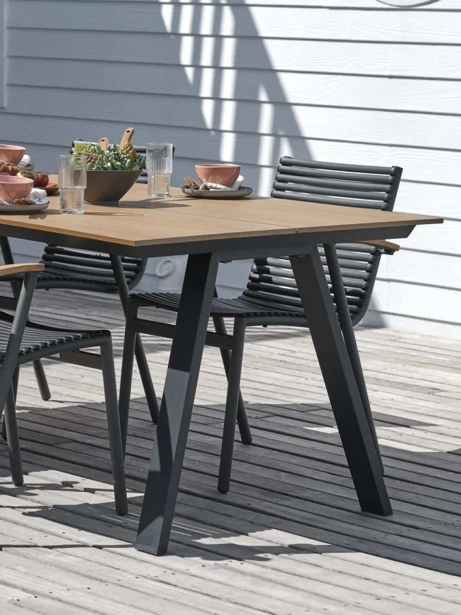 Table de jardin avec plateau en imitation bois. Structure et pieds en aluminium peint par poudrage. L’imitation bois a l’apparence et la texture du bois naturel sans nécessiter d’entretien. L’aluminium est un matériau léger et robuste qui ne rouille pas. l100 x L220 x H74 cm