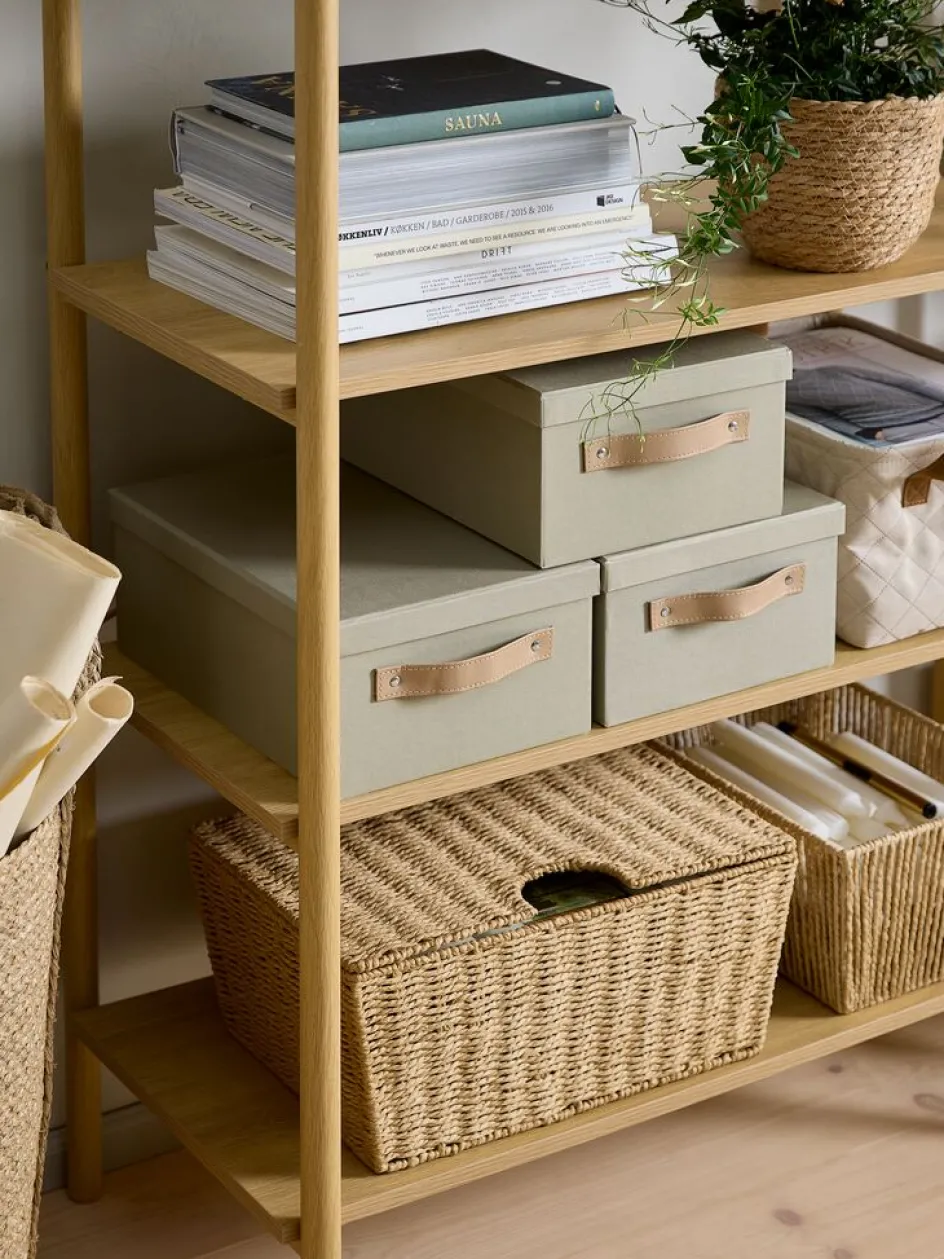 Boîte de rangement vert kaki en carton et papier. Elle est équipée d’une poignée sur le côté. Le couvercle aide à maintenir une apparence ordonnée. Sa taille compacte s’adapte bien aux étagères ou aux placards. l23 x L33 x H14 cm