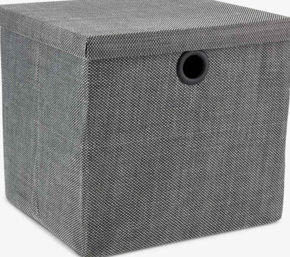 Boîte de rangement en carton et tissu gris, conçue pour le rangement à la maison ou au bureau. Avec une poignée pratique pour la sortir facilement d’une étagère ou d’un placard. l32 x L30 x H29 cm