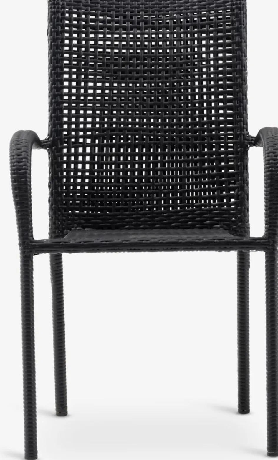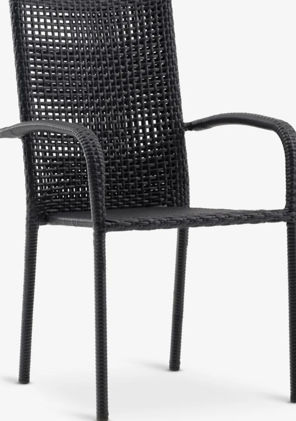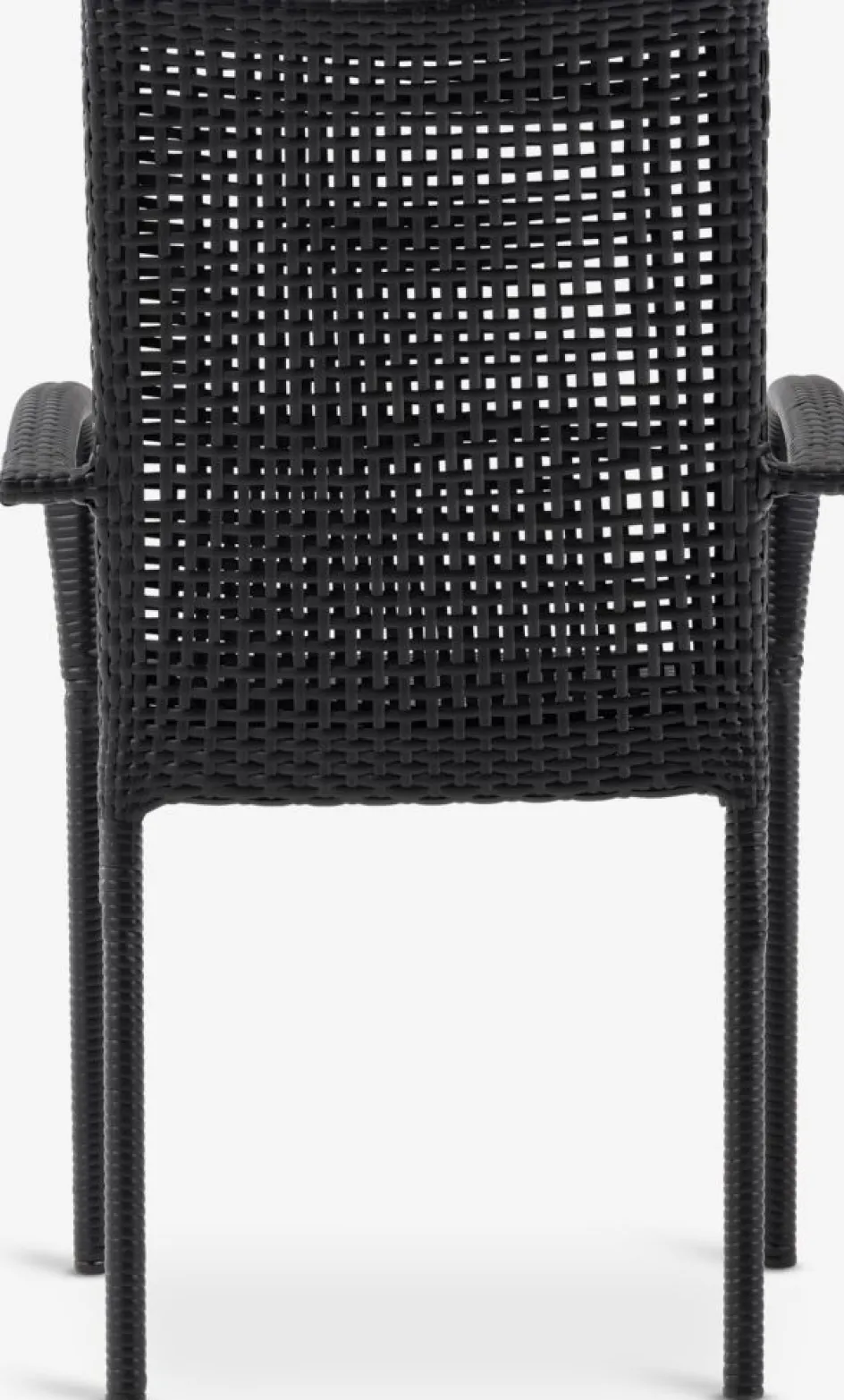 Chaise empilable noire en polyrotin avec une structure en acier peint par poudrage. Le polyrotin donne un aspect naturel à l’osier, tout en étant résistant aux intempéries et sans entretien. La chaise de jardin peut être empilée pour un rangement compact.