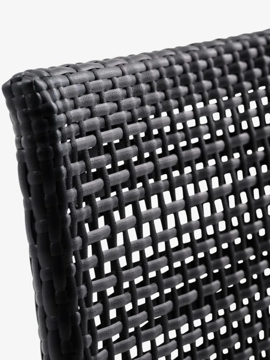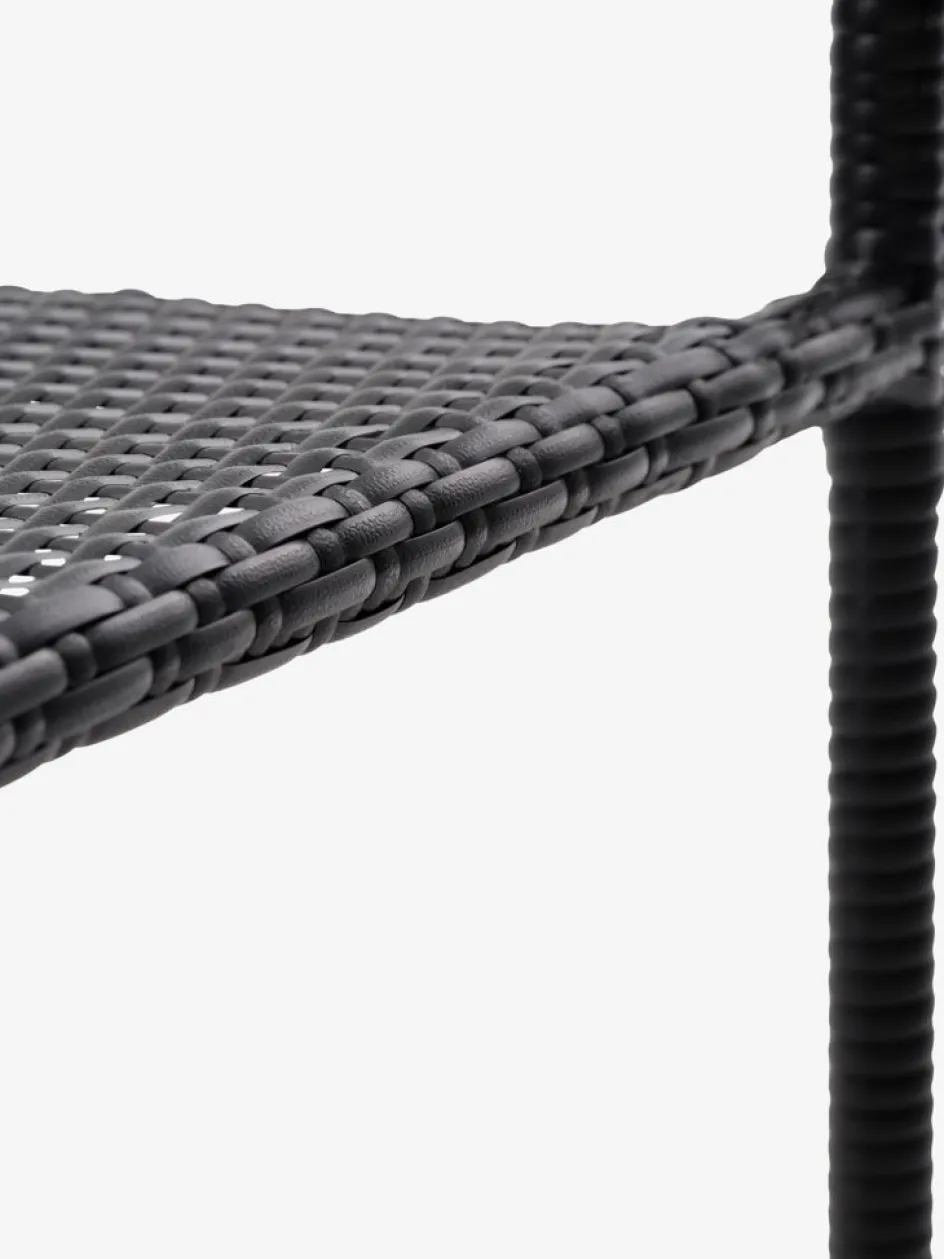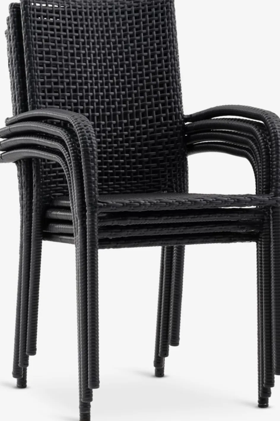 Chaise empilable noire en polyrotin avec une structure en acier peint par poudrage. Le polyrotin donne un aspect naturel à l’osier, tout en étant résistant aux intempéries et sans entretien. La chaise de jardin peut être empilée pour un rangement compact.