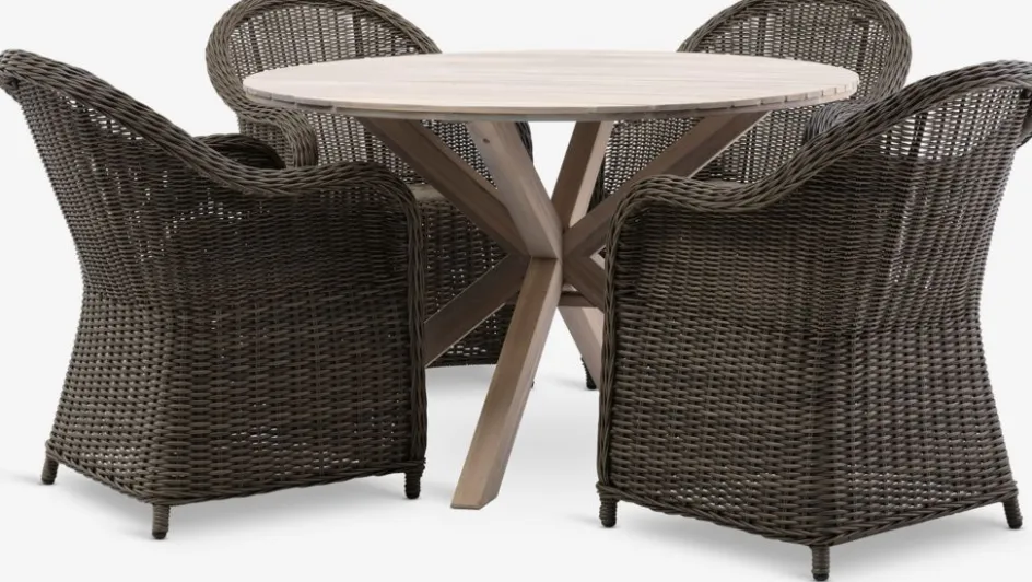 Ensemble meubles de jardin 4 personnes. Table : Bois d’acacia massif FSC® huilé. Ø120 x H77 cm. Chaise : Aluminium et polyrotin (polyéthylène). l59 x H86 x P71 cm