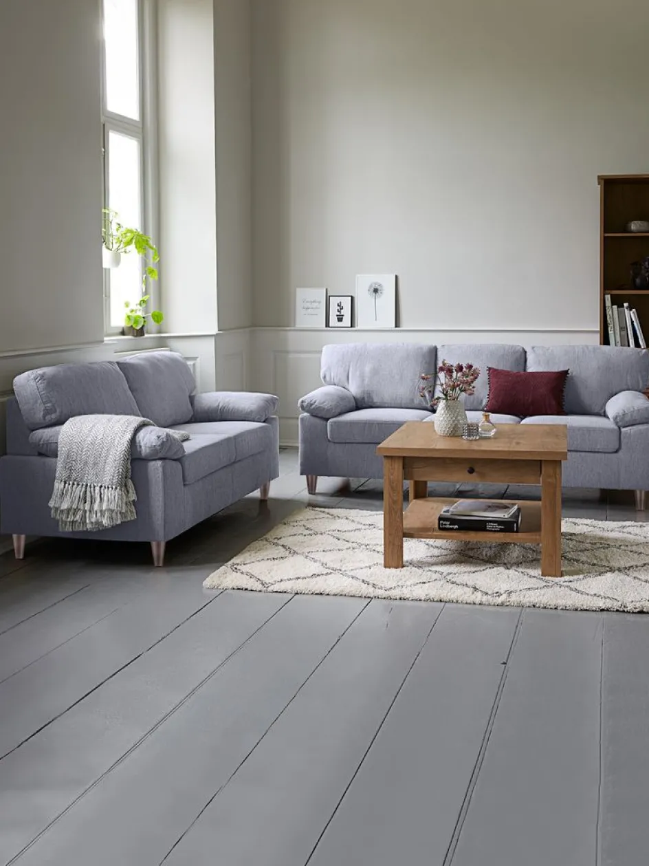 Structure : contreplaqué, bois dur. Rembourrage : 72 (2 places) ou 108 (3 places) ressorts ensachés/m2, mousse polyuréthane. Revêtement : 100% polyester. Piètement : bois de caoutchouc massif. 2 places : l154 x H85 x P84 cm / 3 places : l210 x H85 x P84 cm