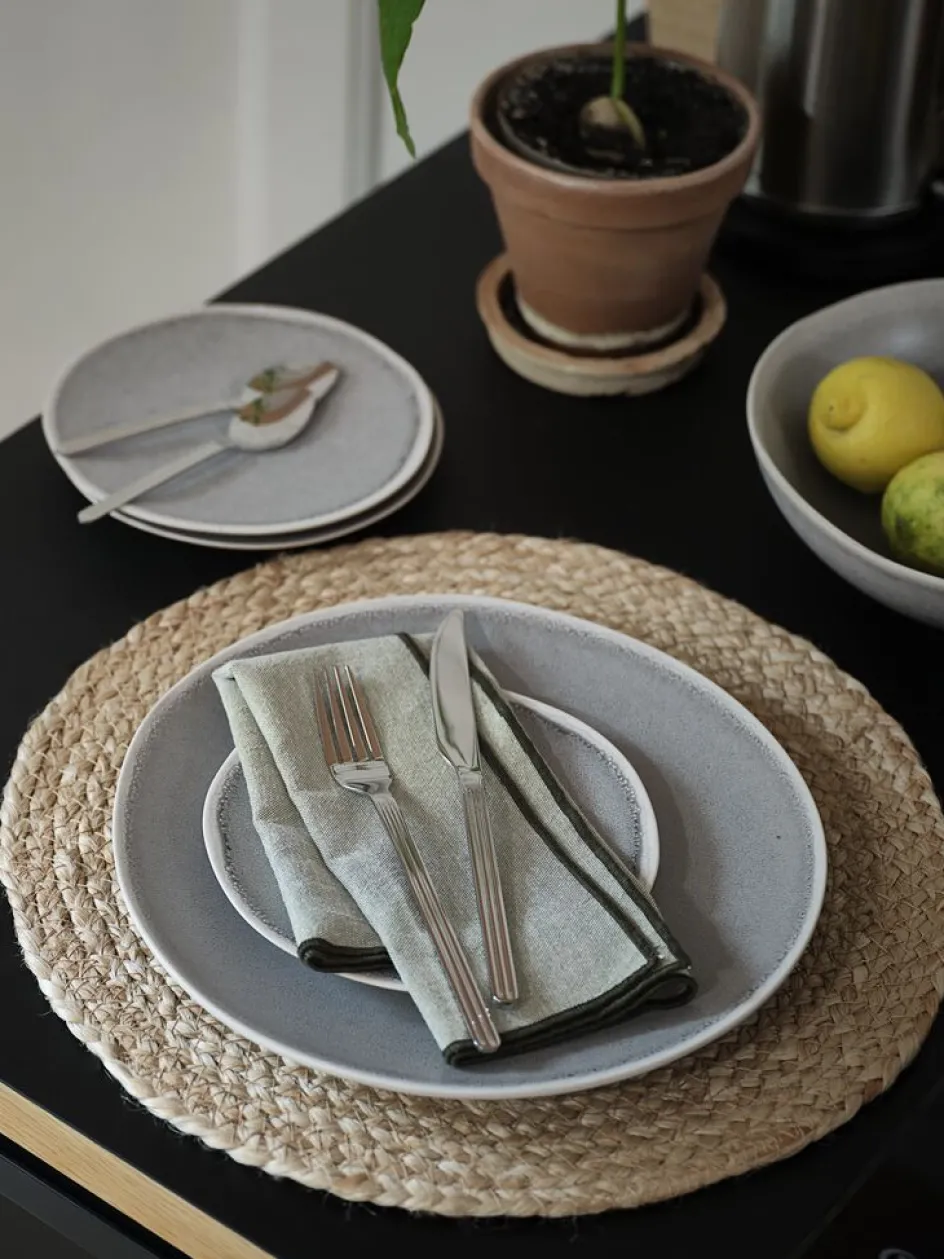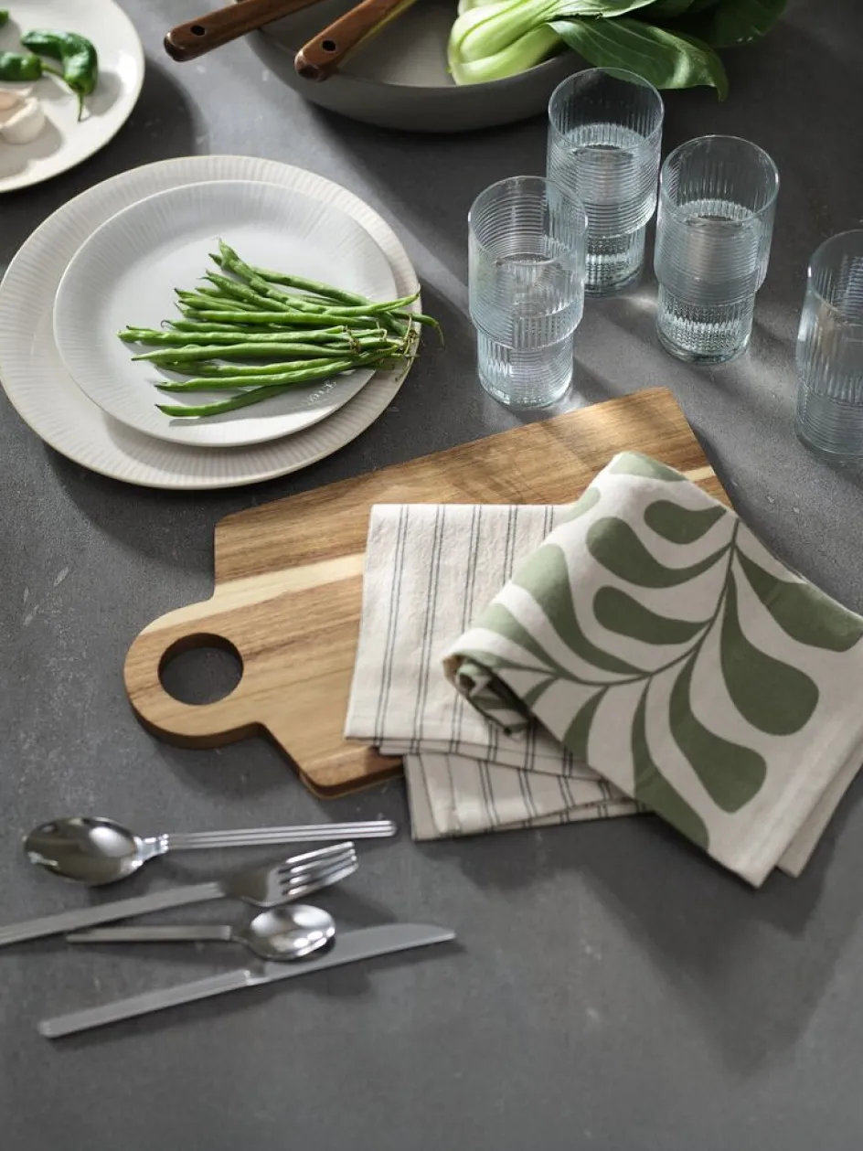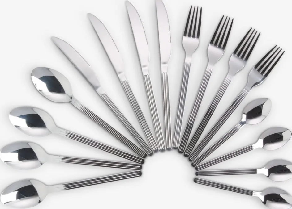 Set de couverts élégant de 16 pièces en acier poli miroir. Le set se caractérise par des rainures qui donnent à chaque couteau, fourchette, cuillère et cuillère à café un aspect unique. Résistant au lave-vaisselle.
