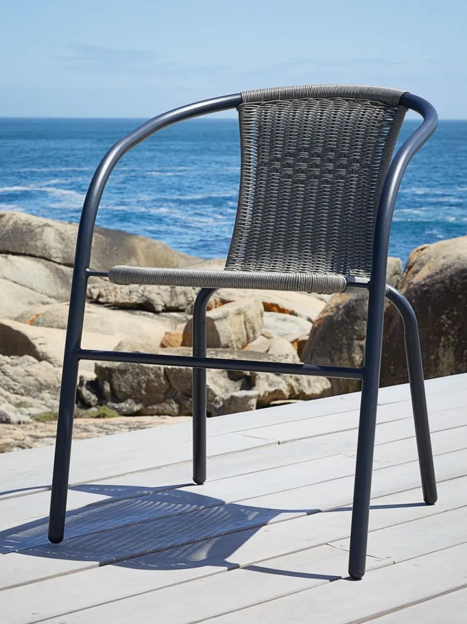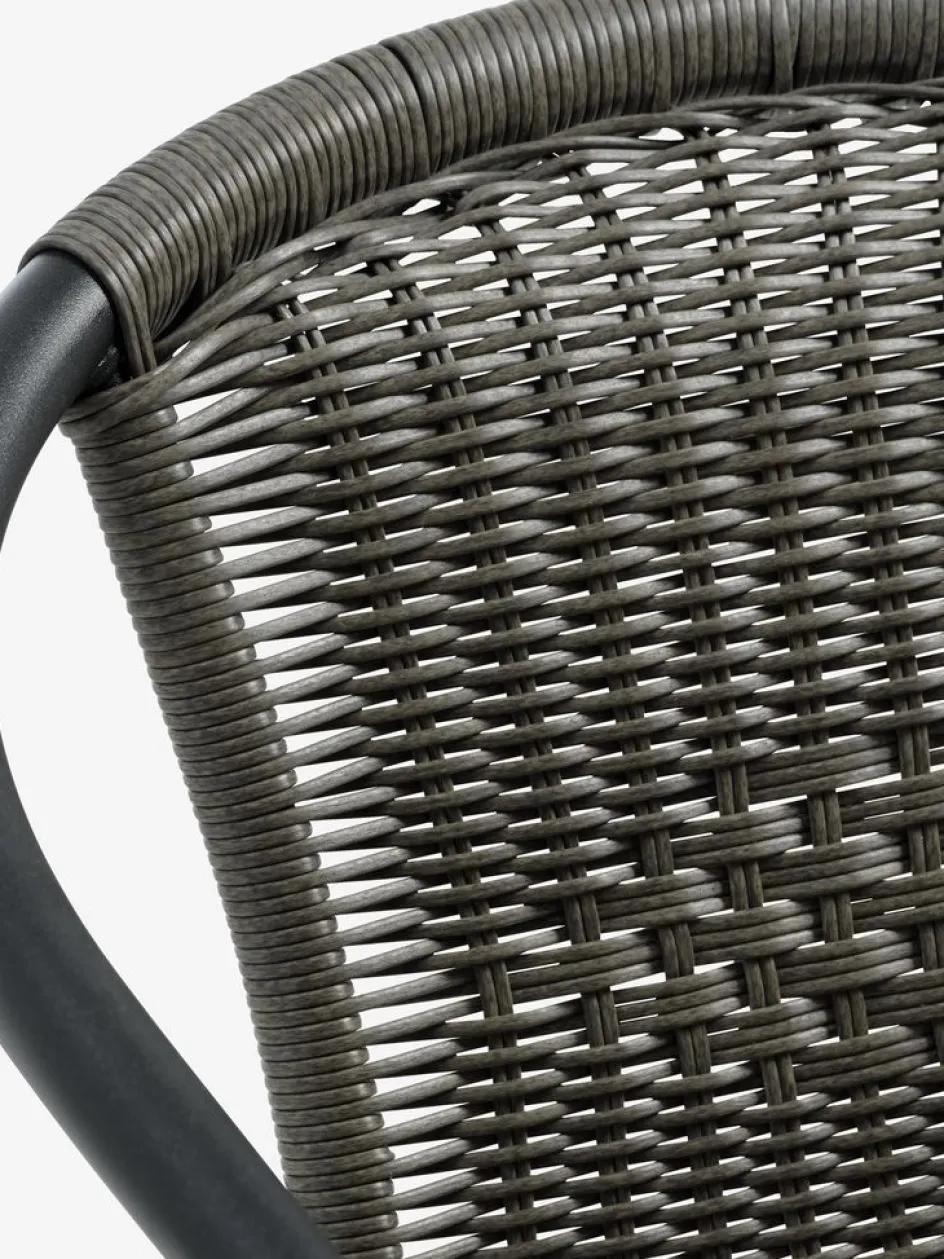 Chaise empilable grise avec assise et dossier en polyrotin et structure en acier peint par poudrage. Le polyrotin donne un aspect naturel au rotin, tout en étant résistant aux intempéries et sans entretien. La chaise de jardin peut être empilée pour un rangement compact.
