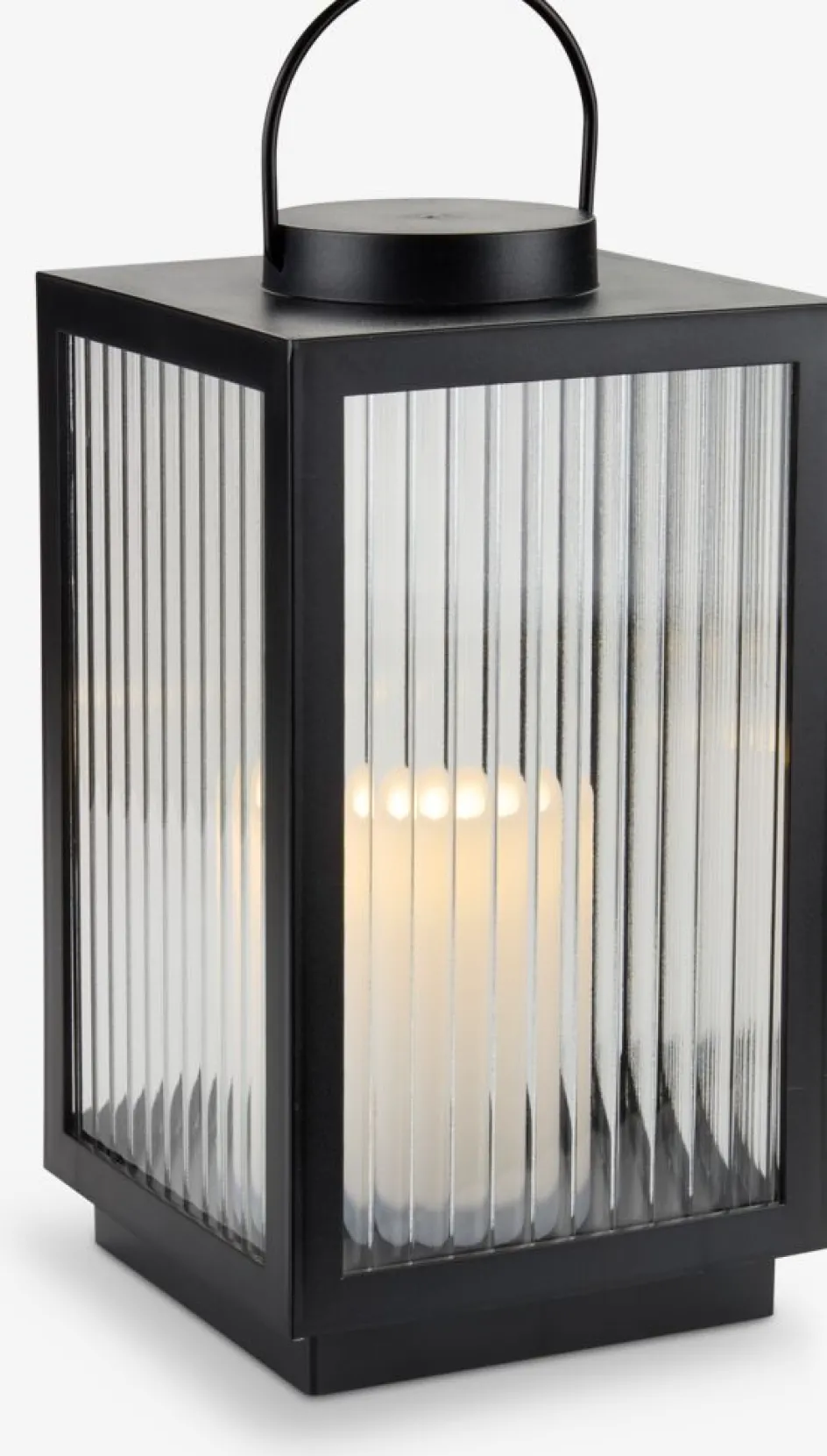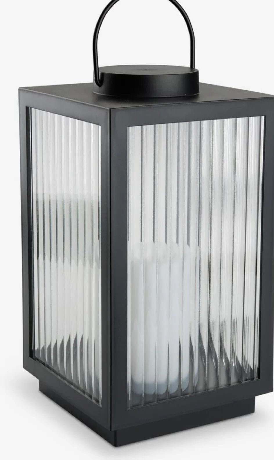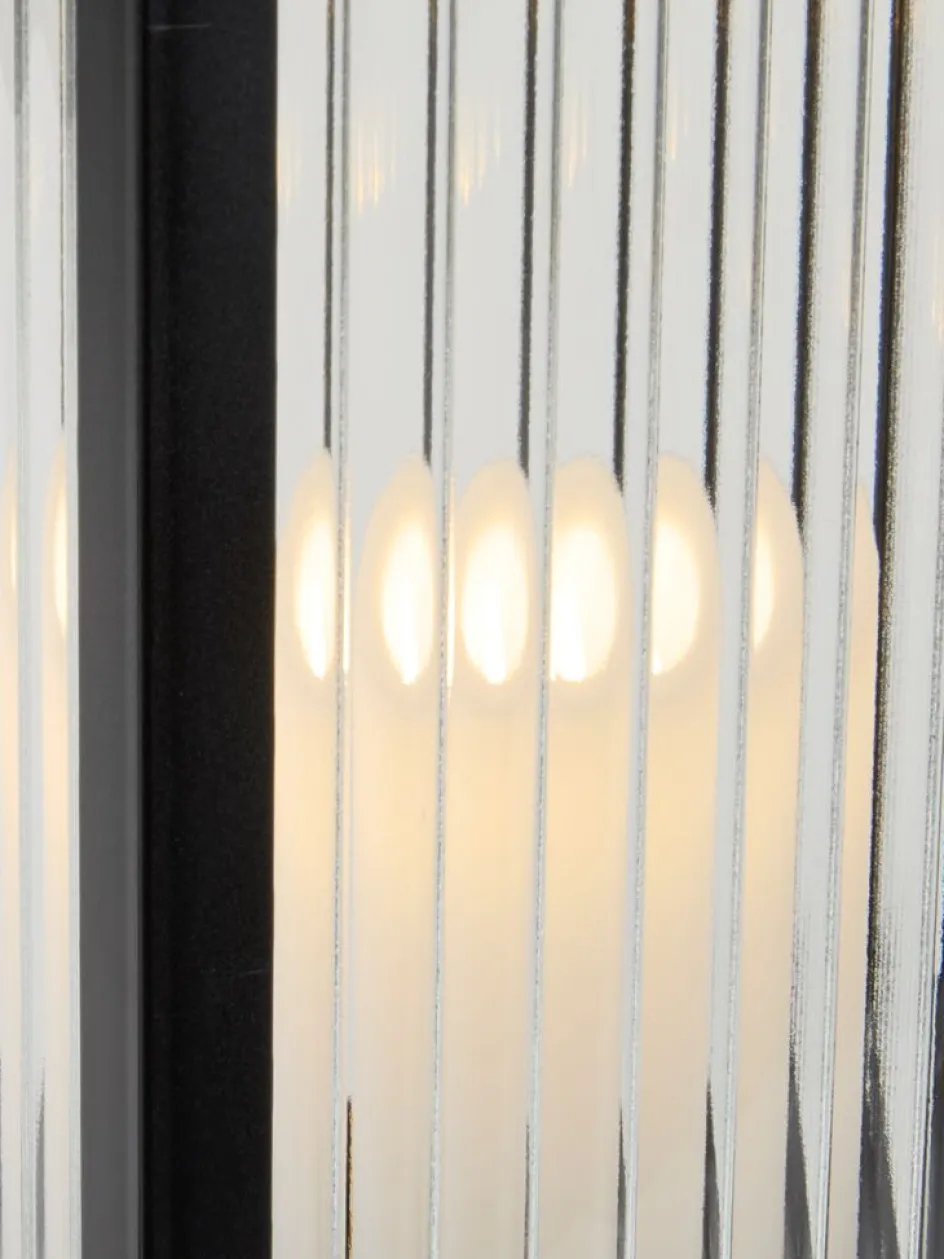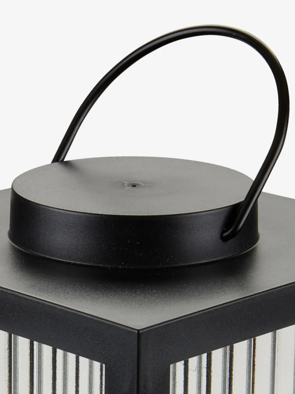 Lanterne au design noir moderne avec des panneaux en verre nervuré. La lanterne à piles est dotée d’une LED intégrée qui diffuse une lueur chaude et agréable. Elle dispose également d’une fonction de minuterie pratique pour un éclairage automatique. Nécessite 2 piles AA (non incluses). l16 x L16 x H29 cm