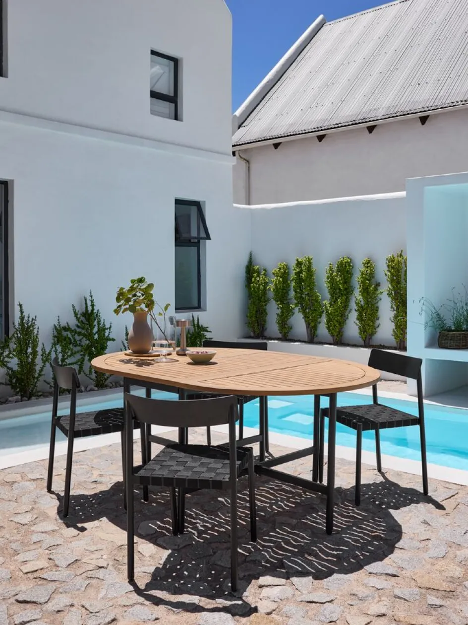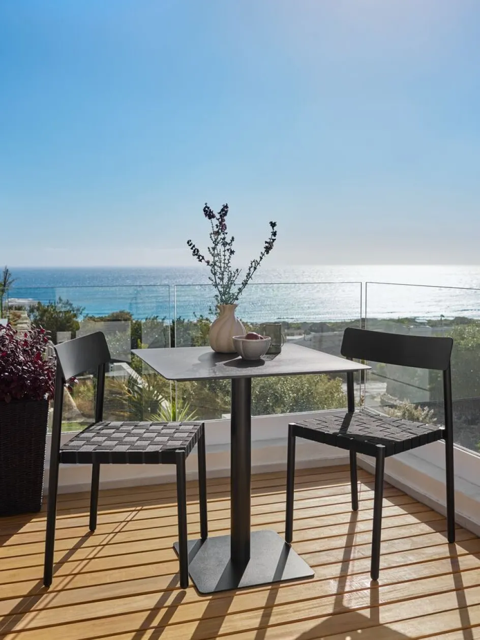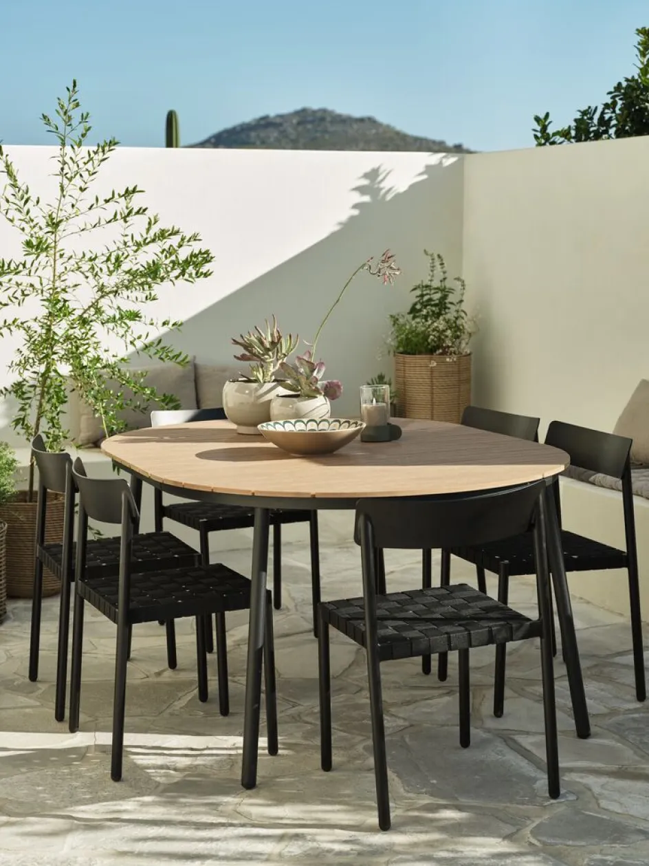 Chaise empilable noire avec assise en polyester tissé et structure en aluminium peint par poudrage. L’aluminium est un matériau léger et robuste qui ne rouille pas. La chaise de jardin peut être empilée pour un rangement compact.