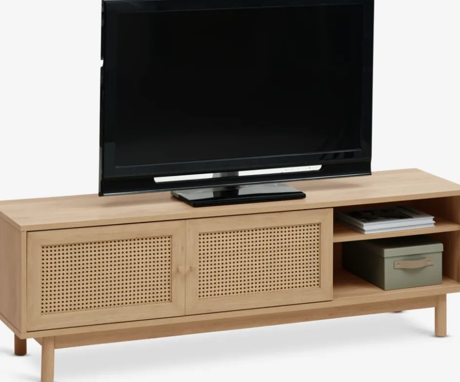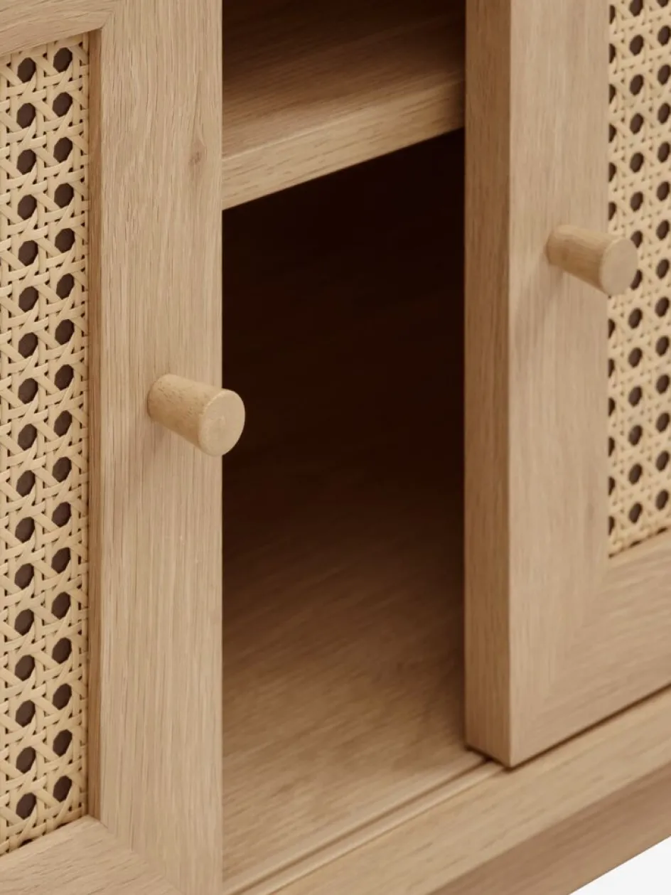 Bois massif, polyrotin et placage décoratif. Avec portes coulissantes. l160 x H50 x P40 cm