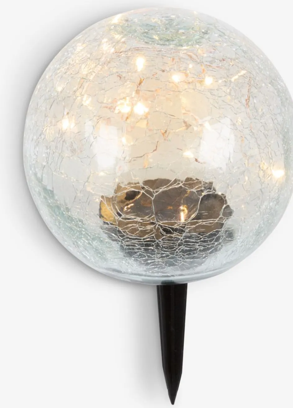 Lampe solaire avec boule en verre clair à l’aspect verre taillé. Pendant la journée, le panneau solaire intégré recharge la batterie et au crépuscule, la lampe s’allume automatiquement. La lampe est placée sur un support pointu, qui peut être facilement planté dans le sol. Ø15 x H25 cm