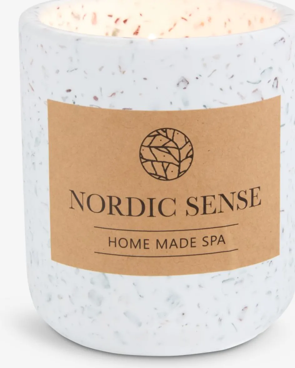 Bougie parfumée dans un contenant blanc cassé en terrazzo. Il s’agit d’un ajout élégant à toute décoration intérieure et la bougie dégage un parfum subtil et agréable. Elle brûle environ 20 heures. Ø9 x H10 cm