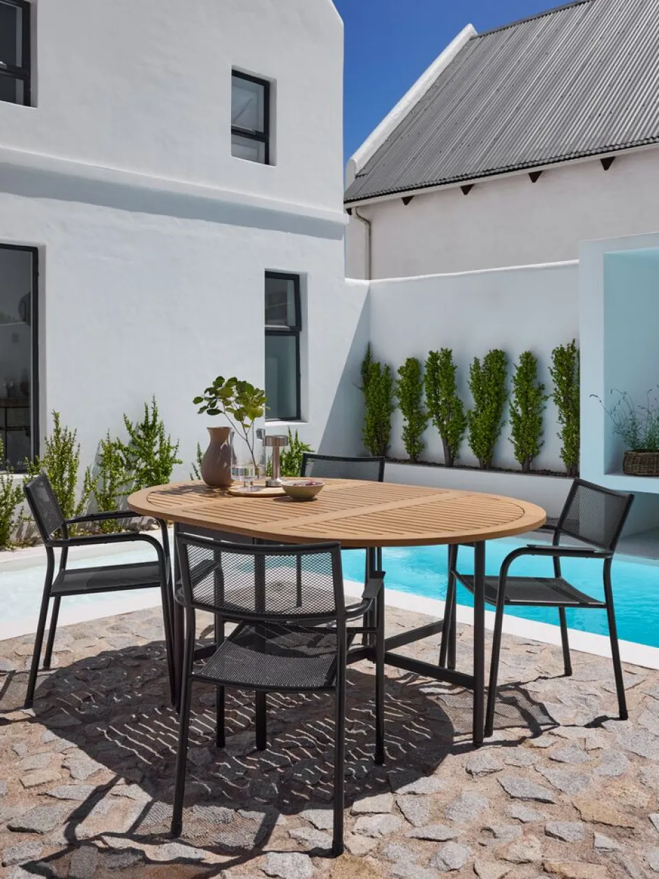 Chaise empilable noire avec assise et dossier en acier maillé et structure en acier. L’acier est traité avec un revêtement antirouille Durasint®. La chaise de jardin peut être empilée pour un rangement compact.