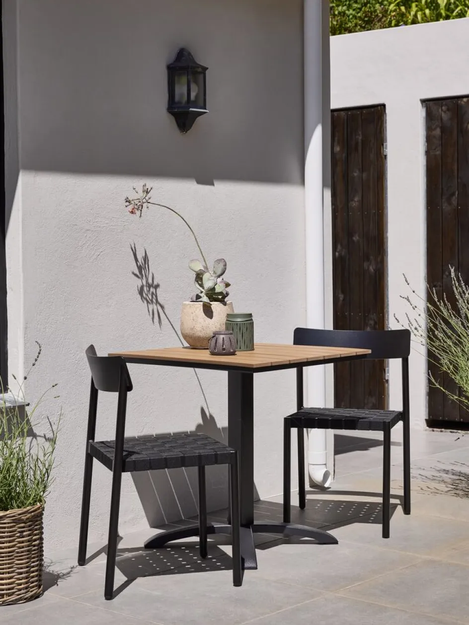Table de bistrot avec un plateau en imitation bois et une base grise en aluminium peint par poudrage. L’imitation bois a l’apparence et la texture du bois naturel sans nécessiter d’entretien. L’aluminium est un matériau léger et robuste qui ne rouille pas. l70 x L70 x H73 cm