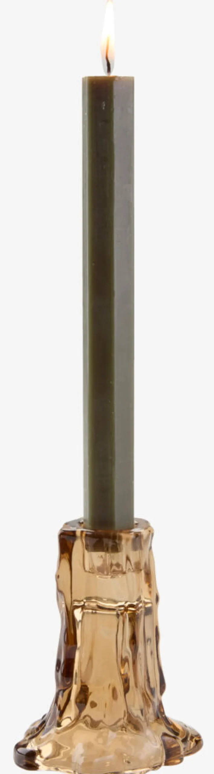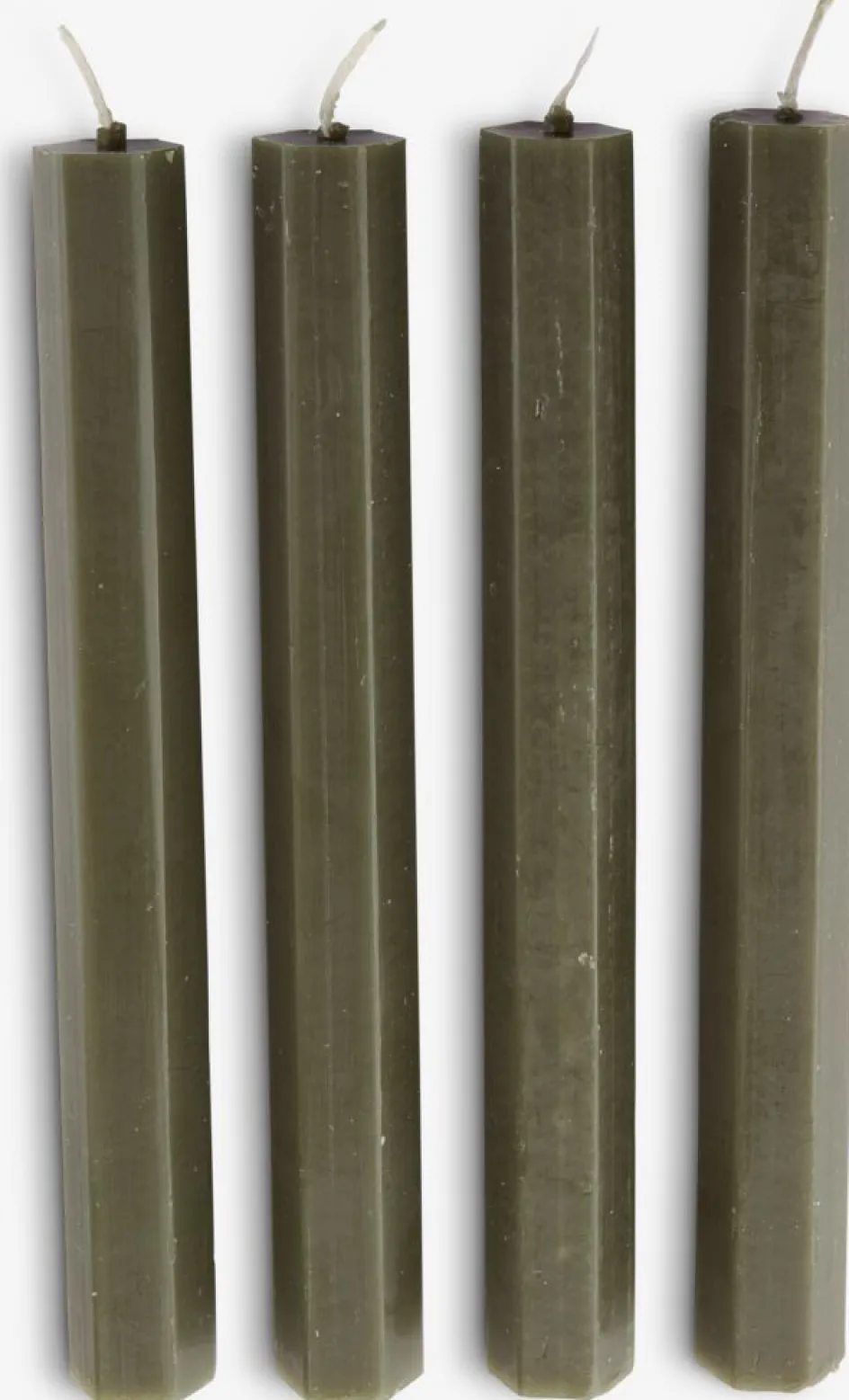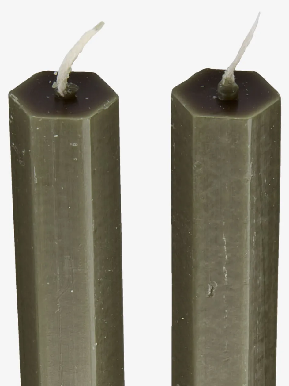 Bougie pour chandelier coloris olive foncé à la forme hexagonale singulière. Chaque bougie offre une durée d’éclairage d’environ 9 heures. Lot de 4. Ø2 x H20 cm