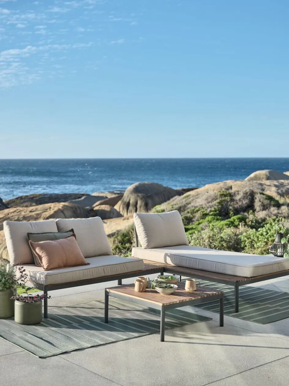 Module méridienne pour ensemble lounge modulable. Aluminium et bois massif FSC® huilé. Incl. coussins haut de gamme avec housse résistante tissée. Réversible. l93 x H72 x P181 cm