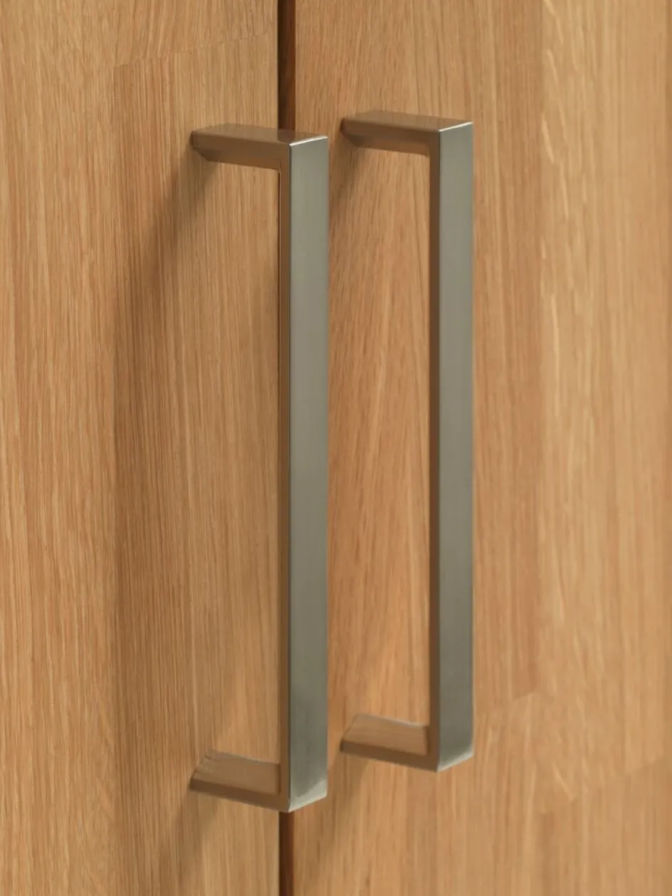 Placage chêne. Portes soft-close. Tiroirs soft-close avec glissières d’extension complète. Intérieur de garde-robe : 1 étagère et 1 tringle à vêtements. l96 x H190 x P60 cm
