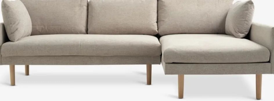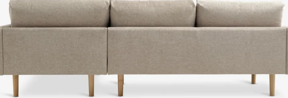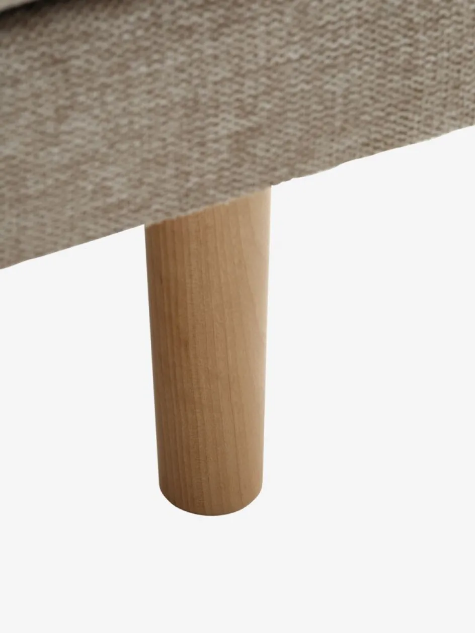 Structure : MDF, panneau de particules, contreplaqué, pin massif. Garnissage : mousse polyuréthane (siège : 22/28/30 kg/m³ kg/m³). Revêtement : polyester. Pieds : bouleau massif. Non réversible. 2,5 places. l244 x H84 x P95/157 cm