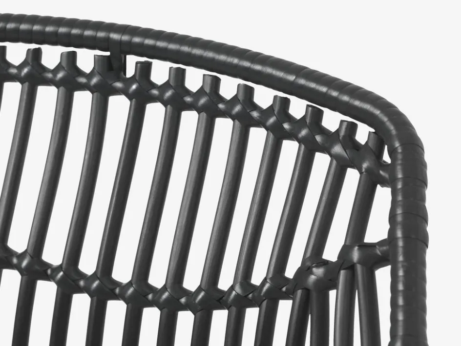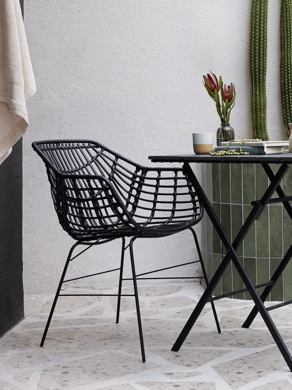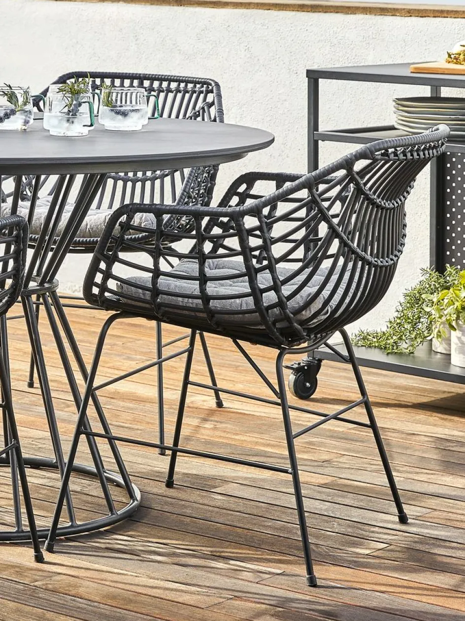 Chaise de jardin noire avec assise et dossier en polyrotin et pieds assortis en acier peint par poudrage. Le polyrotin donne un aspect naturel à l’osier, tout en étant résistant aux intempéries et sans entretien.