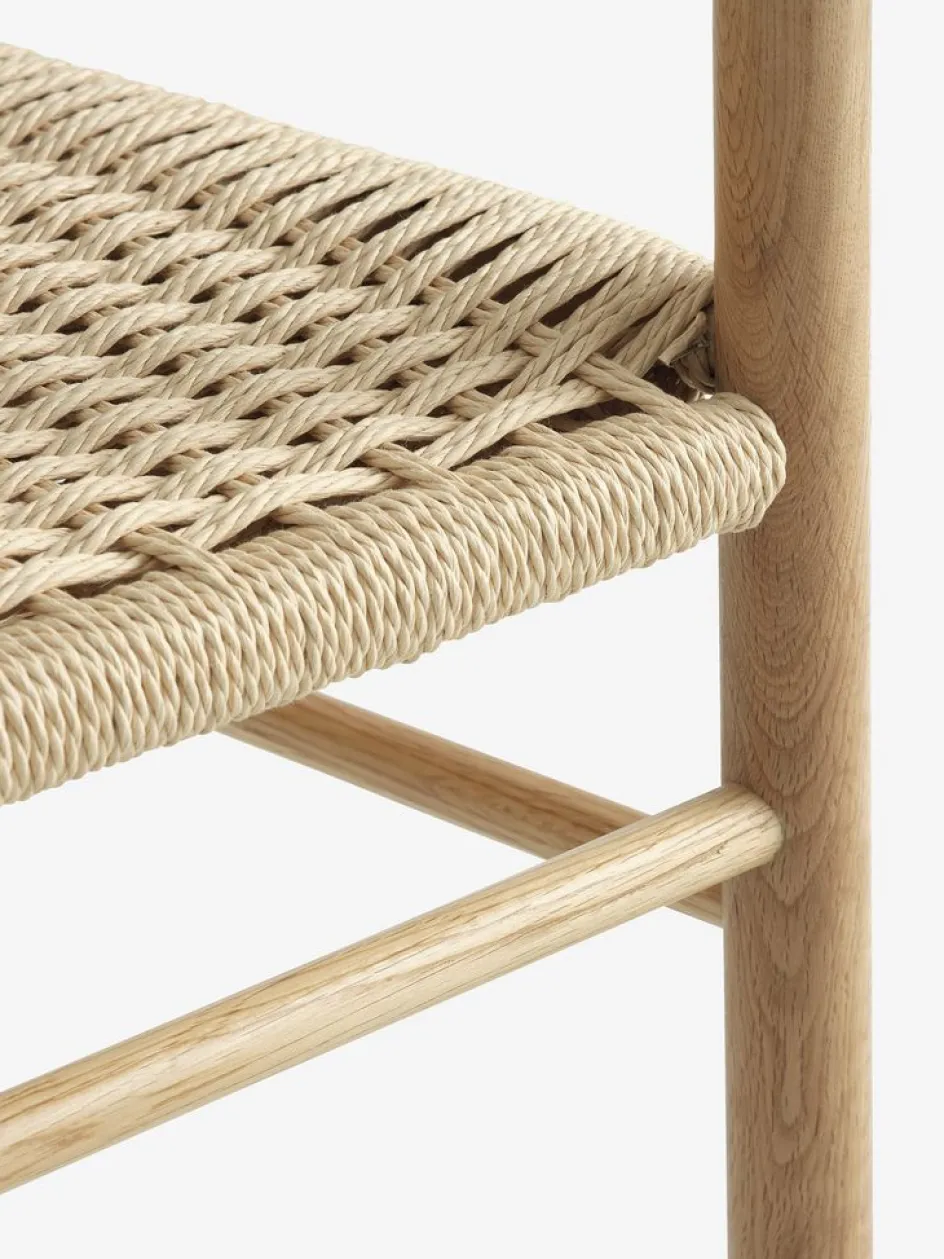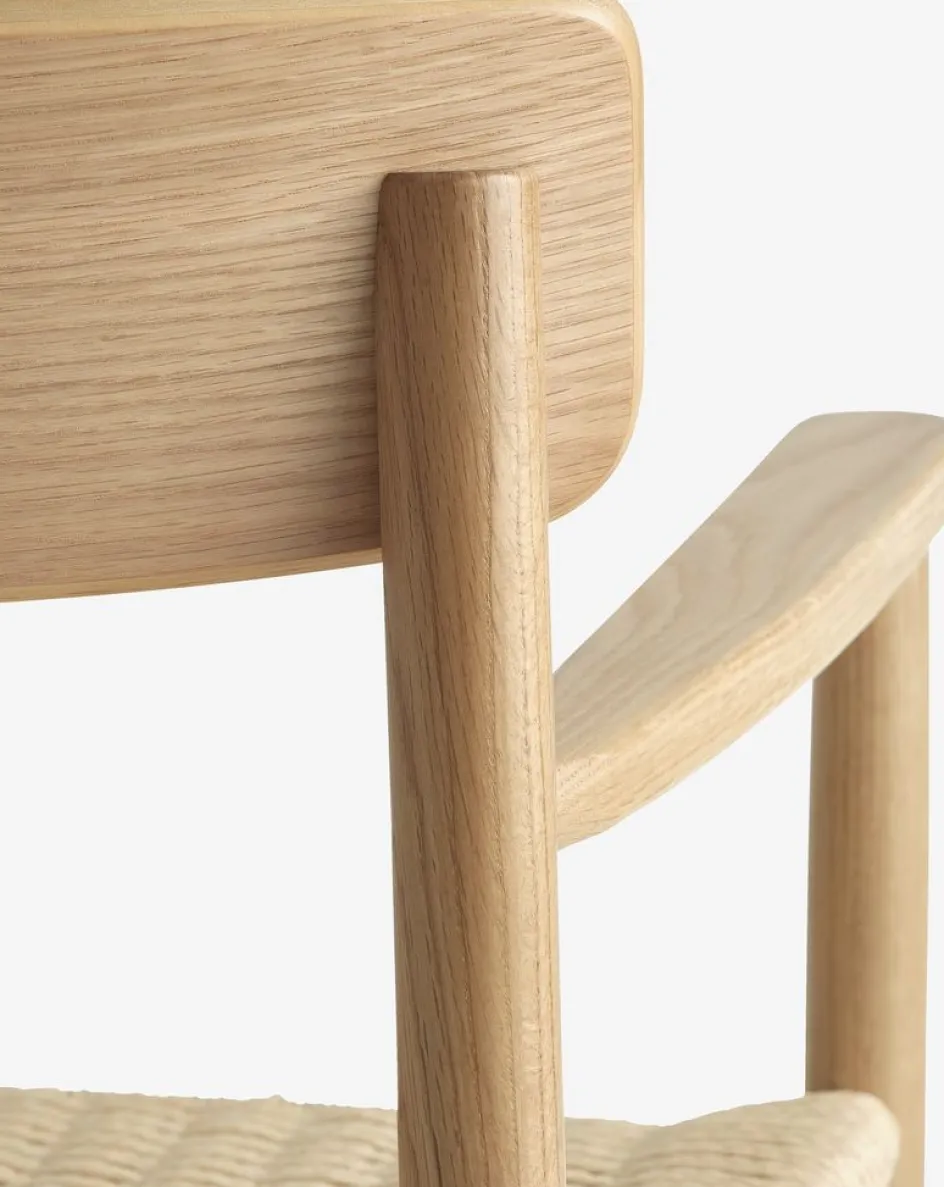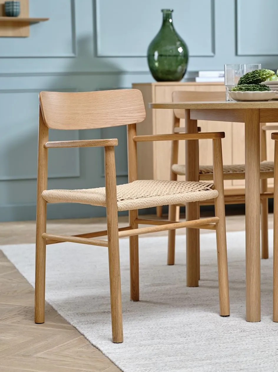Chaise de salle à manger avec accoudoirs offrant un soutien et un confort supplémentaires. Assise en corde de papier tressée et cadre en chêne massif et placage chêne.