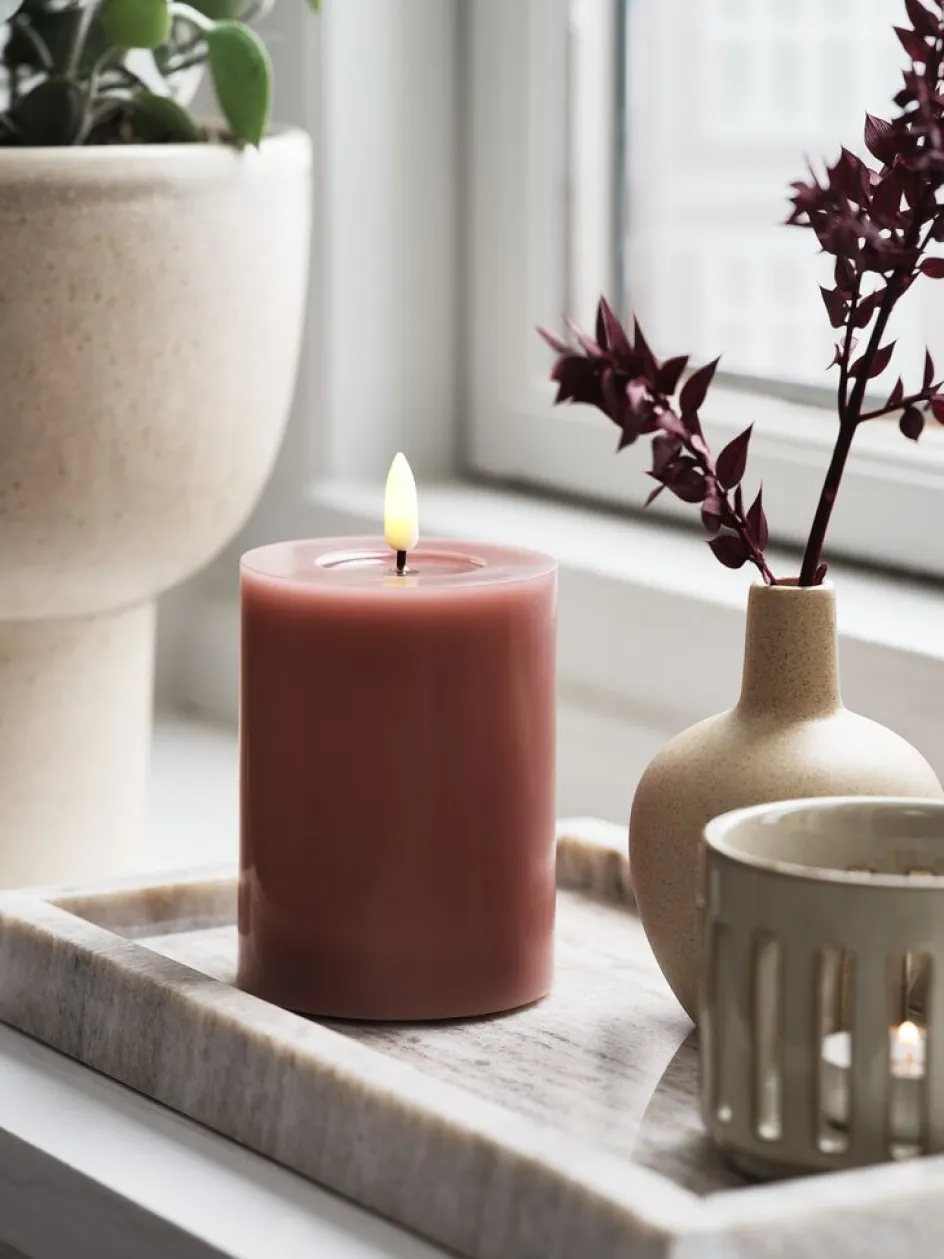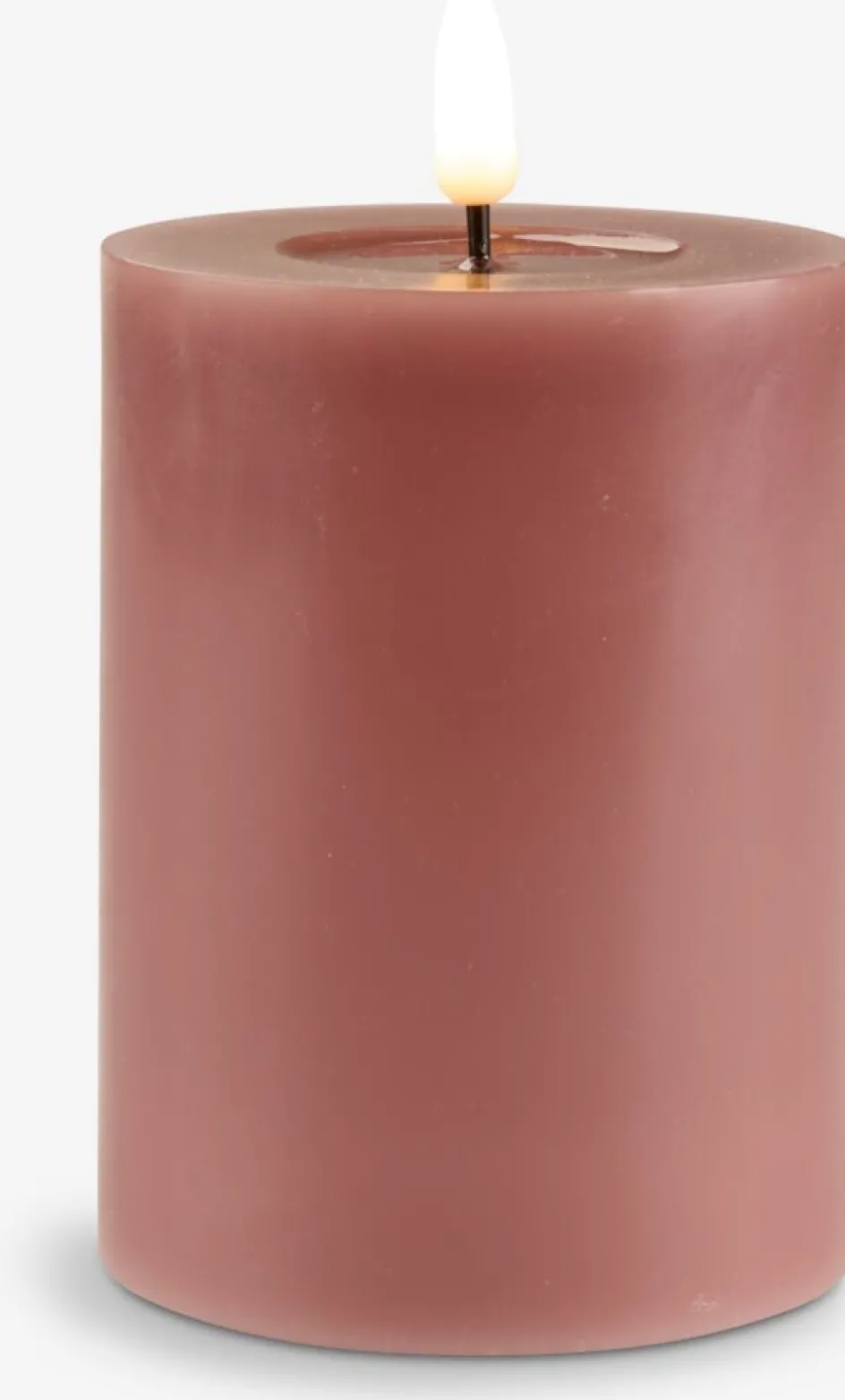Bougie pilier LED de couleur rose douce. Elle est fabriquée à partir de cire pour lui donner un aspect réaliste. La fonction minuterie a un intervalle de 6 heures allumée et 8 heures éteinte. Ø8 x H10 cm