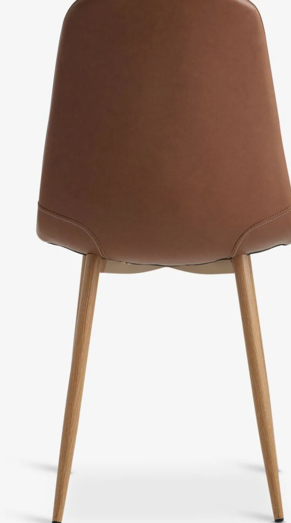 Chaise de salle à manger avec assise rembourrée et dossier coloris cognac. Pieds en acier aspect chêne.