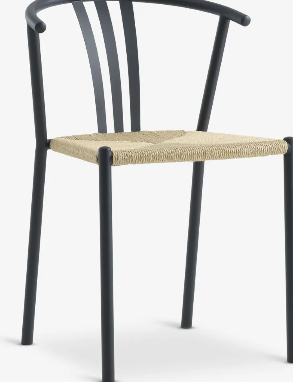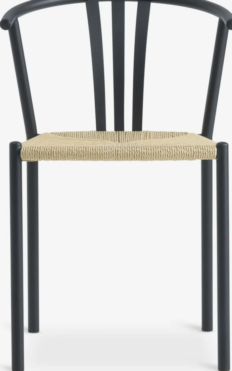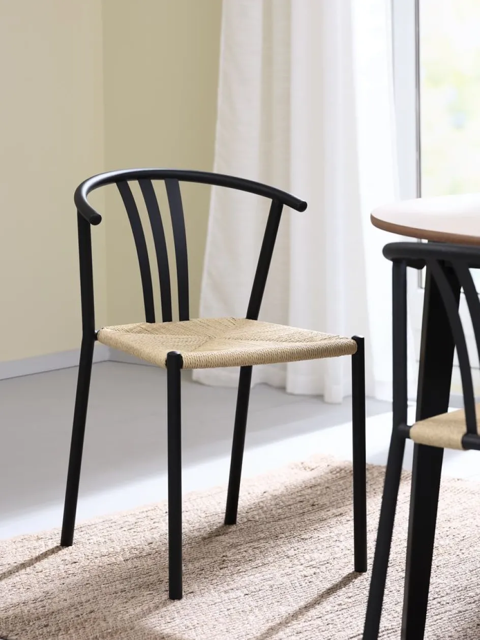 Chaise de salle à manger avec assise en corde de papier tressée. Cadre en acier noir avec dossier incurvé.