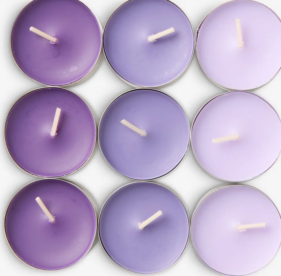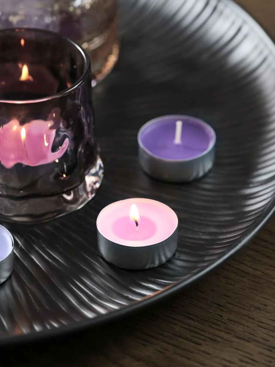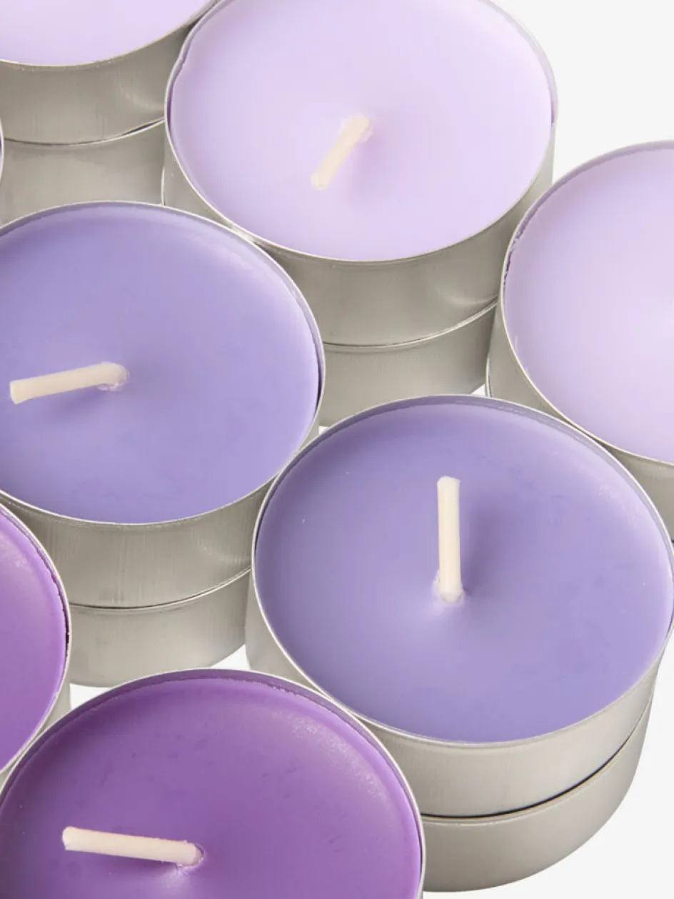 Bougies chauffe-plat dans différentes nuances de violet avec un parfum apaisant de lavande. Utilisez-les pour ajouter une lueur douce et un parfum agréable à n’importe quelle pièce de votre intérieur. Lot de 18. Ø4 x H2 cm
